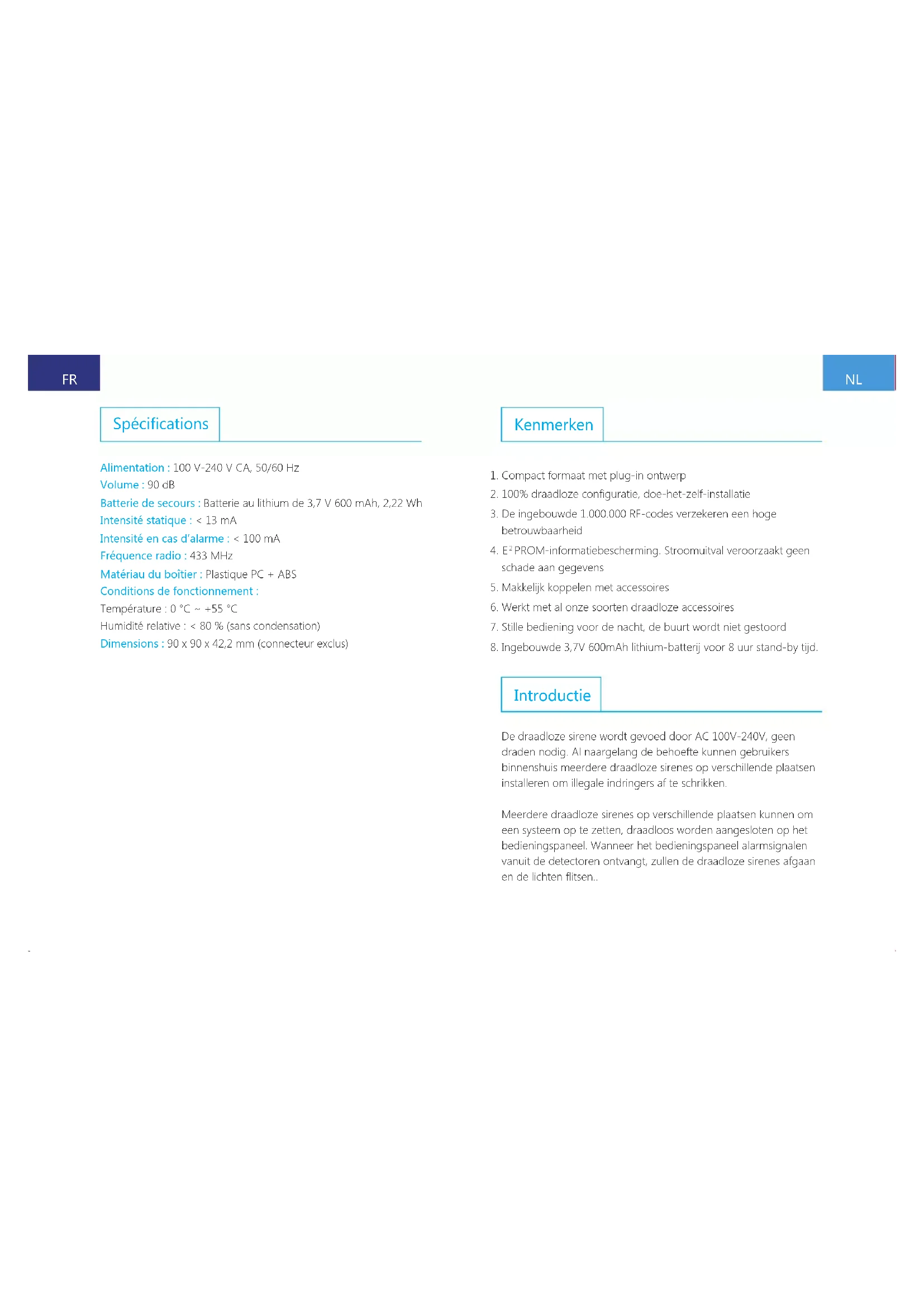 Sirene In-/uitschakelen Inschakelen In de standaardinstelling is de sirene uitgeschakeld. Steek de sirene in een AC-stopcontact en druk op de aan/uit-schakelaar. De sirene wordt ingeschakeld na een lange pieptoon. Uitschakelen Druk één keer op de verbindingsknop in de werkingsmodus. Druk vervolgens 6 seconden op de verbindingsknop tot een langdurige pieptoon is te horen. De sirene is uitgeschakeld. Flitslicht licht-indicatie Wanneer het wordt ingeschakeld, is het itslicht aan na één its. Wanneer het wordt uitgeschakeld, dooft het itslicht na twee itsen. zNL NL Werking als draadloze sirene Als het apparaat als een draadloze sirene werkt, moet de sirene allereerst met het draadloze bedieningspaneel worden verbonden. Als het bedieningspaneel alarm slaat, dan gaat de sirene af en het itslicht itst om de illegale indringers af te schrikken. Verbinden met het bedieningspaneel Allereerst drukt u op de verbindingsknop (0,5 seconde) en de draadloze sirene piept één keer. 3 seconden later geeft de sirene nog een pieptoon en het licht knippert. Vervolgens gaat de sirene in de verbindingsstatus. Ten tweede, druk op de [SOS] - of [Alarm aan] -knop op het paneel. De draadloze sirene en het bedieningspaneel zijn succesvol verbonden na één pieptoon. Druk opnieuw op de verbindingsknop om de verbindingsstatus te verlaten na één pieptoon. Opmerkingen: Gelieve geen enkele accessoire te activeren tijdens het verbinden met het bedieningspaneel. Testen: Druk op de [Alarm aan] -knop op de afstandsbediening. Wanneer de ingebouwde sirene van het bedieningspaneel en de draadloze sirene één keer piepen, is de verbinding geslaagd. Zo niet, dan is de verbinding mislukt. Maak dan opnieuw verbinding. Werking als zelfstandig alarmsysteem De sirene kan als opzichzelf staand alarmsysteem dienen door draadloze accessoires toe te voegen. Als de sirene is ingeschakeld en een van de sensoren wordt geactiveerd, zal de sirene afgaan en zal het licht itsen om indringers af te schrikken. Aansluiten draadloze accessoires Allereerst drukt u op de verbindingsknop (0,5 seconde) en de draadloze sirene piept één keer. 3 seconden later geeft het nog een pieptoon en het licht knippert. Dan gaat de sirene in de verbindingsstatus. Ten tweede, activeer het draadloze accessoire eenmaal (zoals: druk op een willekeurige knop op de afstandsbediening, scheid de zender en de magneet van een magneetcontact, druk op de testknop van de bewegingsdetector) en het wordt verbonden na één pieptoon. Herhaal de bovenstaande handeling om andere accessoires te verbinden. Let op: De sirene ondersteunt tot 40 draadloze accessoires.NL NL Testen: Druk op de [Alarm aan] -knop op de afstandsbediening. Wanneer de draadloze sirene één keer knippert, betekent dit dat de afstandsbediening succesvol is aangesloten. Activeer dan de sensor en de sirene zal afgaan. Zo niet, dan is de verbinding mislukt. Maak opnieuw verbinding. Verwijder alle accessoires of bedieningspanelen Als u draadloze accessoires kwijtraakt, met name de draadloze afstandsbedieningen, dan is het raadzaam om alle accessoires te verwijderen en hen voor de veiligheid vervolgens opnieuw aan te sluiten. Druk 6 seconden op de verbindingsknop, totdat u een pieptoon hoort. Op hetzelfde tijdstip knippert de LED tweemaal. Dit betekent dat alle aangesloten accessoires en panelen zijn verwijderd. Vertraging bij binnenkomst en vertrek Als u geen gebruik wilt maken van de afstandsbediening, kan de vertragingstijd bij binnenkomst en vertrek worden ingesteld. Na de installatie, als u het systeem inschakelt, piept de sirene om de 5 seconden, totdat het overgaat tot inschakelen van het alarm. Als de detectoren (behalve die in 24-uurszone) worden geactiveerd, zal de sirene na de vertragingstijd afgaan. (Sirene gaat 3 minuten lang af.) De installatiemethode is als volgt: Druk tweemaal op de verbindingsknop: vertraging is 30 seconden. Druk drie keer op de verbindingsknop: vertraging is 60 seconden. Druk vier keer op de verbindingsknop: geen vertraging. Standaardinstelling: Geen vertraging. Let op: Druk twee keer op de [Alarm aan]-knop op de afstandsbediening en het systeem schakelt onmiddellijk in. Aan-/uitschakelaar nachtlamp Wanneer de sirene werkt als zelfstandig alarm, kan het ook worden gebruikt als LED-nachtlamp. Druk op de [Thuis modus] -knop op de afstandsbediening. De LED-indicator knippert eenmaal en druk vervolgens op binnen 3 seconden opnieuw op de [Thuis modus] -knop. De sirene schakelt geluidloos over naar de thuis-modus en de nachtlamp is aan. Druk op [Alarm uit] -knop, de sirene wordt uitgeschakeld en het itslicht gaat uit.ESNL Specicaties Stroomvoorziening: AC 100 V-240 V, 50/60 Hz Volume: 90 dB Back-up batterij: 3,7V 600 mAh lithium batterij, 2,22Wh Stroomverbruik statisch: < 13 mA Stroomverbruik alarm: < 100 mA Radiofrequentie: 433 MHz Materiaal behuizing: PC en ABS kunststof Voorwaarden voor goede werking: Temperatuur: 0 °C tot +55 °C Relatieve vochtigheid: < 80% (geen condensatie) Afmetingen: 90,0 x 90,0 x 42,2 mm (stekkergedeelte uitgesloten) Características