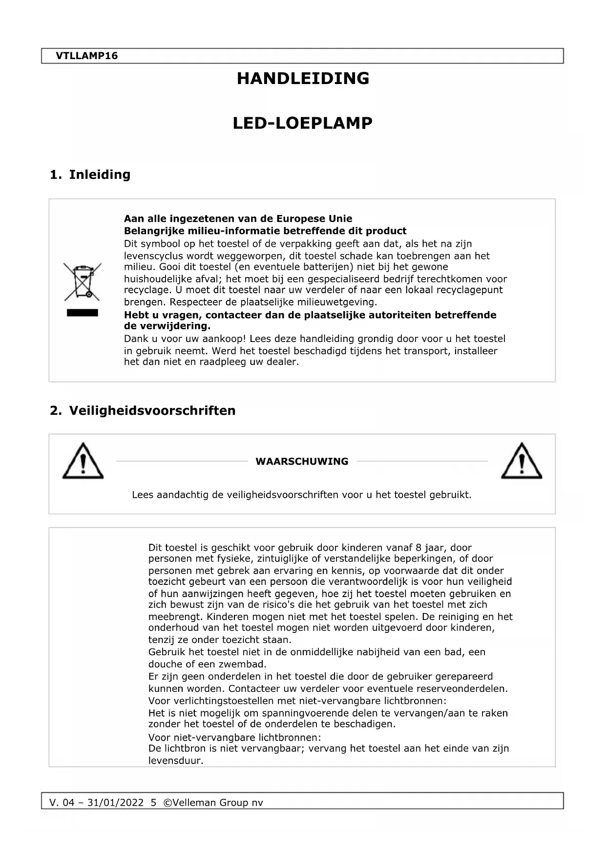 Gebruik dit toestel enkel met originele accessoires. Velleman Group nv is niet aansprakelijk voor schade of kwetsuren bij (verkeerd) gebruik van dit toestel. Voor meer informatie over dit product en de laatste versie van deze handleiding, zie www.velleman.eu. De informatie in deze handleiding kan te allen tijde worden gewijzigd zonder voorafgaande kennisgeving. © AUTEURSRECHT Velleman Group nv heeft het auteursrecht voor deze handleiding. Alle wereldwijde rechten voorbehouden. Het is niet toegestaan om deze handleiding of gedeelten ervan over te nemen, te kopiëren, te vertalen, te bewerken en op te slaan op een elektronisch medium zonder voorafgaande schriftelijke toestemming van de rechthebbende.VTLLAMP16