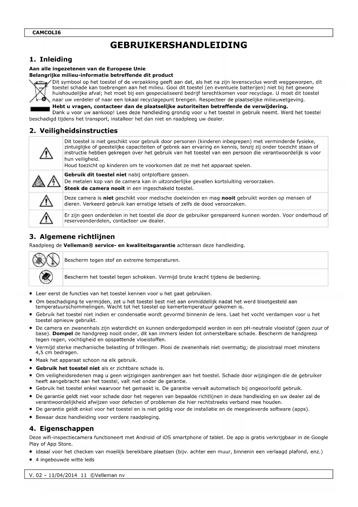 Gebruik dit toestel enkel met originele accessoires. Velleman nv is niet aansprakelijk voor schade of kwetsuren bij (verkeerd) gebruik van dit toestel. Voor meer informatie over dit product en de laatste versie van deze handleiding, zie www.velleman.eu. De informatie in deze handleiding kan te allen tijde worden gewijzigd zonder voorafgaande kennisgeving. Alle geregistreerde handelsmerken en handelsnamen zijn eigendom van hun respectieve bezitters, en zijn enkel gebruikt als voorbeeld van de compatibiliteit tussen onze producten en de producten van de verschillende fabrikanten. iPad, iPod touch, iPhone zijn handelsmerken van Apple Inc, geregistreerd in de VS en andere landen. IOS is een handelsmerk of een geregistreerd handelsmerk van Cisco in de Verenigde Staten en andere landen en wordt gebruikt onder licentie. Android is een handelsmerk van Google Inc. Skype is een handelsmerk van Skype en Velleman is niet verwant, gesponsord, goedgekeurd of op een andere manier geassocieerd door/met de Skype-ondernemingengroep © AUTEURSRECHT Velleman nv heeft het auteursrecht voor deze handleiding. Alle wereldwijde rechten voorbehouden. Het is niet toegestaan om deze handleiding of gedeelten ervan over te nemen, te kopiëren, te vertalen, te bewerken en op te slaan op een elektronisch medium zonder voorafgaande schriftelijke toestemming van de rechthebbende.CAMCOLI6
