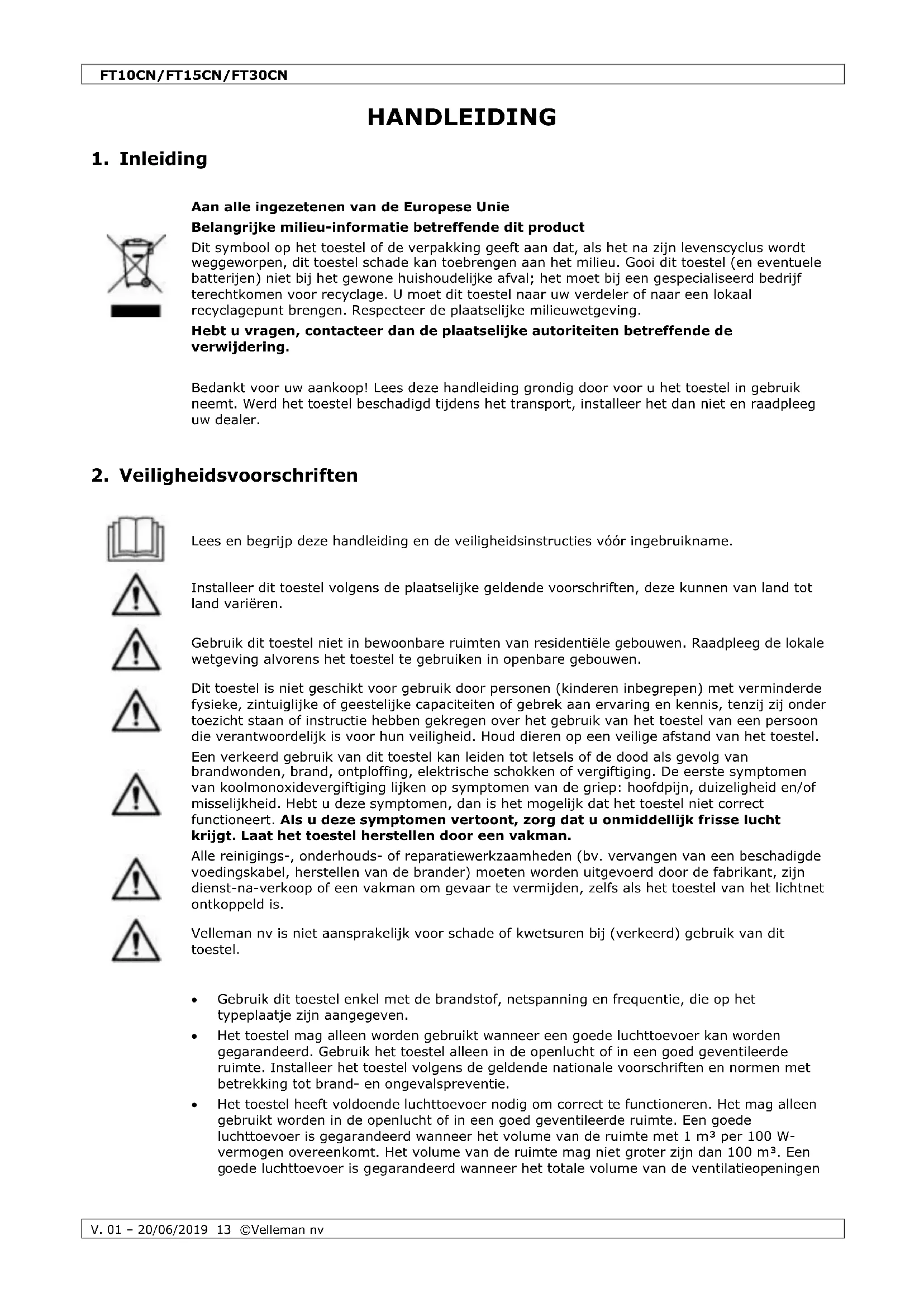 Lees en begrijp deze handleiding en de veiligheidsinstructies vóór ingebruikname. Installeer dit toestel volgens de plaatselijke geldende voorschriften, deze kunnen van land tot land variëren. Gebruik dit toestel niet in bewoonbare ruimten van residentiële gebouwen. Raadpleeg de lokale wetgeving alvorens het toestel te gebruiken in openbare gebouwen. Dit toestel is niet geschikt voor gebruik door personen (kinderen inbegrepen) met verminderde fysieke, zintuiglijke of geestelijke capaciteiten of gebrek aan ervaring en kennis, tenzij zij onder toezicht staan of instructie hebben gekregen over het gebruik van het toestel van een persoon die verantwoordelijk is voor hun veiligheid. Houd dieren op een veilige afstand van het toestel. Een verkeerd gebruik van dit toestel kan leiden tot letsels of de dood als gevolg van brandwonden, brand, ontploffing, elektrische schokken of vergiftiging. De eerste symptomen van koolmonoxidevergiftiging lijken op symptomen van de griep: hoofdpijn, duizeligheid en/of misselijkheid. Hebt u deze symptomen, dan is het mogelijk dat het toestel niet correct functioneert. Als u deze symptomen vertoont, zorg dat u onmiddellijk frisse lucht krijgt. Laat het toestel herstellen door een vakman. Alle reinigings-, onderhouds- of reparatiewerkzaamheden (bv. vervangen van een beschadigde voedingskabel, herstellen van de brander) moeten worden uitgevoerd door de fabrikant, zijn dienst-na-verkoop of een vakman om gevaar te vermijden, zelfs als het toestel van het lichtnet ontkoppeld is. Velleman nv is niet aansprakelijk voor schade of kwetsuren bij (verkeerd) gebruik van dit toestel.