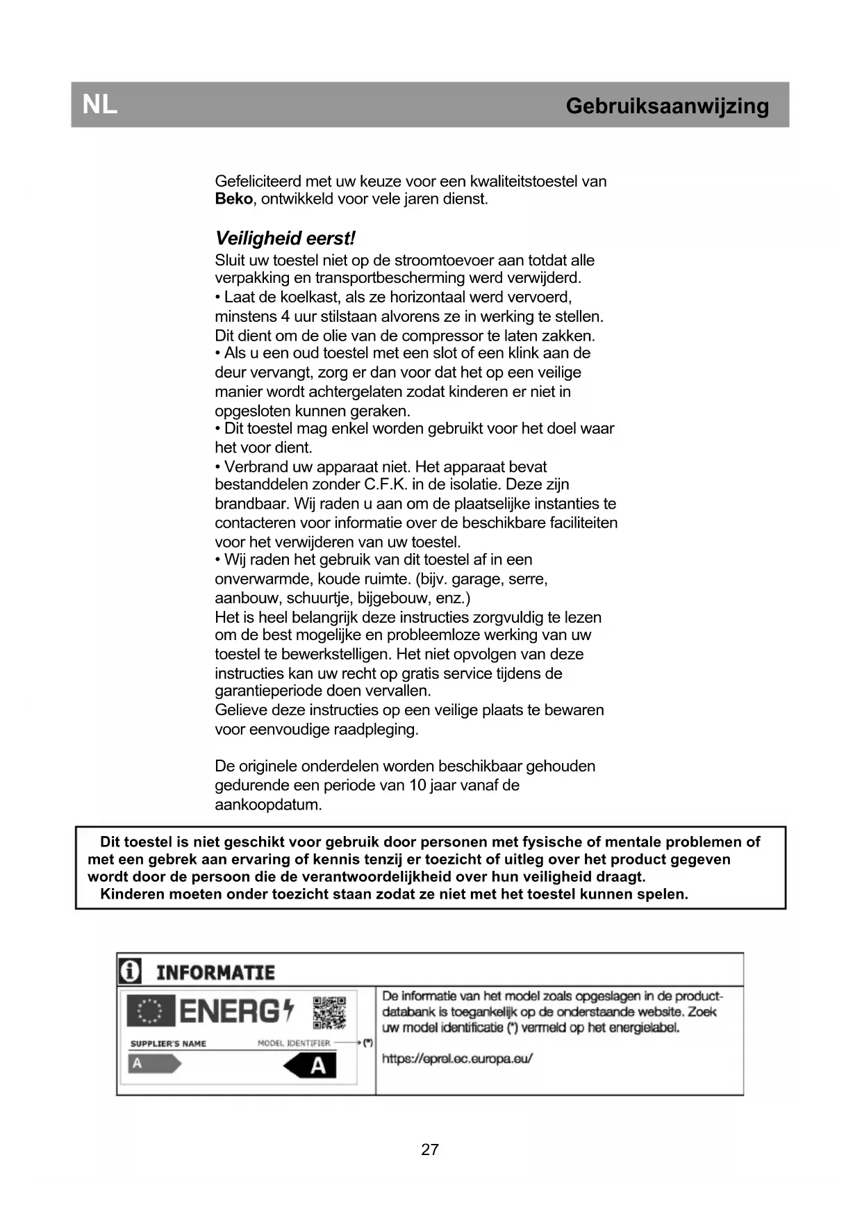 - Wij raden het gebruik van dit toestel af in een onverwarmde, koude ruimte. (bijv. garage, serre, aanbouw, schuurtje, bijgebouw, enz.) Het is heel belangrijk deze instructies zorgvuldig te lezen om de best mogelijke en probleemloze werking van uw toestel te bewerkstelligen. Het niet opvolgen van deze instructies kan uw recht op gratis service tijdens de garantieperiode doen vervallen. Gelieve deze instructies op een veilige plaats te bewaren voor eenvoudige raadpleging. De originele onderdelen worden beschikbaar gehouden gedurende een periode van 10 jaar vanaf de aankoopdatum.