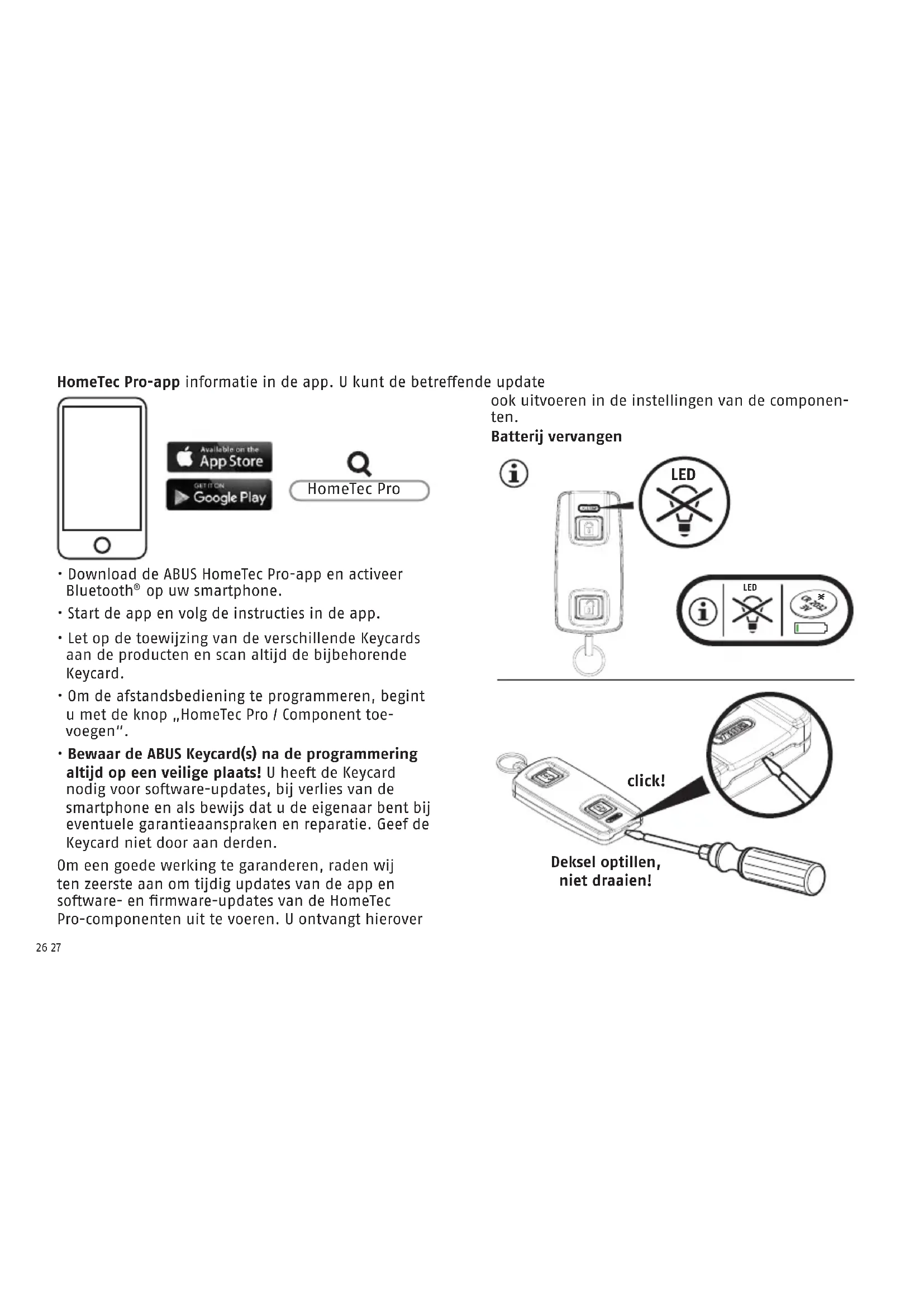 - Bewaar de ABUS Keycard(s) na de programmering altijd op een veilige plaats! U hee de Keycard nodig voor soware-updates, bij verlies van de smartphone en als bewijs dat u de eigenaar bent bij eventuele garantieaanspraken en reparatie. Geef de Keycard niet door aan derden. Om een goede werking te garanderen, raden wij ten zeerste aan om tijdig updates van de app en soware- en rmware-updates van de HomeTec Pro-componenten uit te voeren. U ontvangt hierover HomeTec Pro HomeTec Pro-app informatie in de app. U kunt de betreende update ook uitvoeren in de instellingen van de componen- ten. Batterij vervangen LED LED