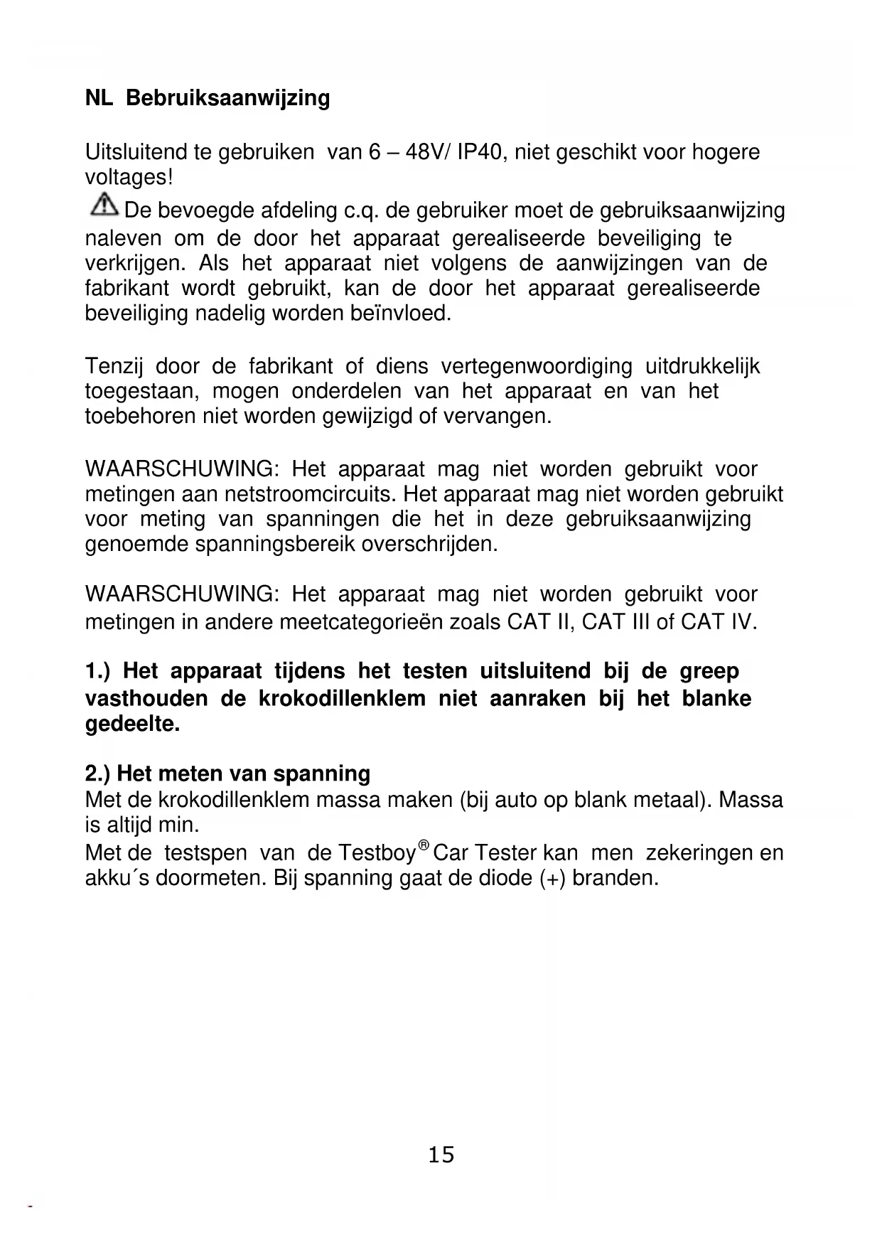 La directive WEEE réglemente la reprise et le recyclage des appareils électriques usagés. Les fabricants d'appa- reils électriques sont tenus de reprendre et de recycler gratuitement les appareils électriques vendus. Les appa- reils électriques ne peuvent donc plus être jetés avec les déchets « normaux ». Les appareils électriques doivent être recyclés et éliminés séparément. Tous les appareils soumis à cette directive portent ce logo.15 NL Bebruiksaanwijzing Uitsluitend te gebruiken van 6 – 48V/ IP40, niet geschikt voor hogere voltages! De bevoegde afdeling c.q. de gebruiker moet de gebruiksaanwijzing naleven om de door het apparaat gerealiseerde beveiliging te verkrijgen. Als het apparaat niet volgens de aanwijzingen van de fabrikant wordt gebruikt, kan de door het apparaat gerealiseerde beveiliging nadelig worden beïnvloed. Tenzij door de fabrikant of diens vertegenwoordiging uitdrukkelijk toegestaan, mogen onderdelen van het apparaat en van het toebehoren niet worden gewijzigd of vervangen. WAARSCHUWING: Het apparaat mag niet worden gebruikt voor metingen aan netstroomcircuits. Het apparaat mag niet worden gebruikt voor meting van spanningen die het in deze gebruiksaanwijzing genoemde spanningsbereik overschrijden. WAARSCHUWING: Het apparaat mag niet worden gebruikt voor metingen in andere meetcategorieën zoals CAT II, CAT III of CAT IV. 1.) Het apparaat tijdens het testen uitsluitend bij de greep vasthouden de krokodillenklem niet aanraken bij het blanke gedeelte. 2.) Het meten van spanning Met de krokodillenklem massa maken (bij auto op blank metaal). Massa is altijd min. Met de testspen van de Testboy