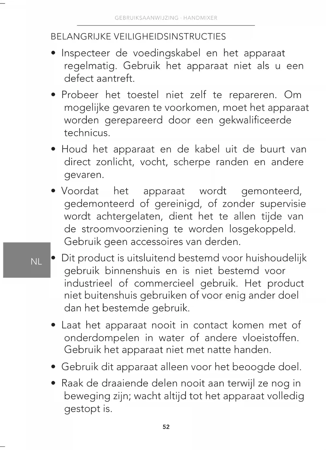 - Waarschuwing: Verkeerd gebruik kan leiden tot letsel.54 GEBRUIKSAANWIJZING · HANDMIXER