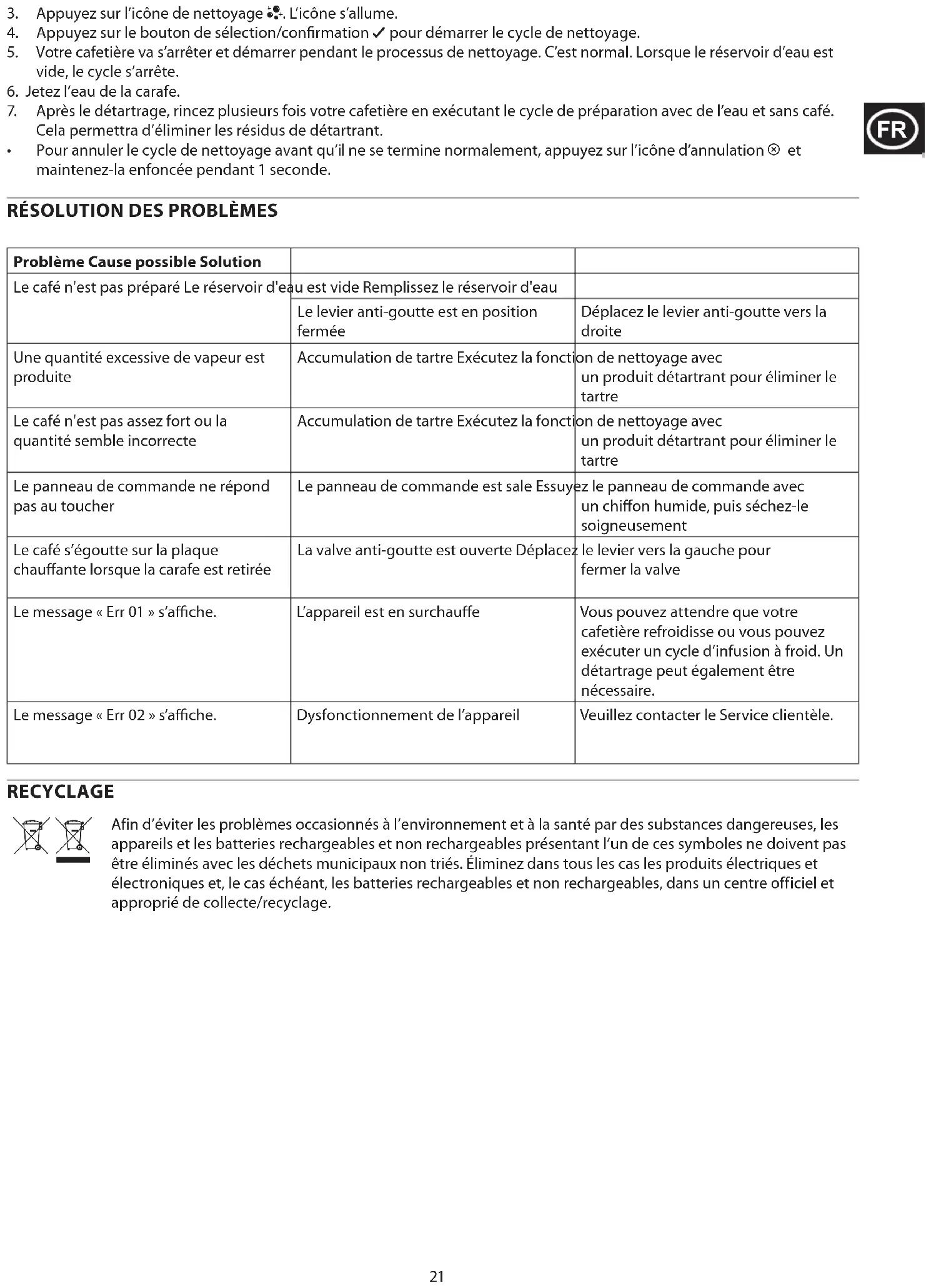 Probleem Mogelijke oorzaak Oplossing De koffie is zwak of de hoeveelheid lijkt niet juist Ophoping van kalk Voer de reinigingsfunctie uit met een ontkalkingsproduct om kalkaanslag te verwijderen Bedieningspaneel reageert niet op aanraking Bedieningspaneel vuil Veeg het bedieningspaneel schoon met een vochtige doek en droog het daarna goed af Koffie druppelt op het warmhoudplaat wanneer de karaf verwijderd wordt Antidruppelventiel open Beweeg de hendel naar links om het ventiel te sluiten “Err 01” wordt op het display weergegeven. Het apparaat is oververhit U kunt wachten tot uw koffiezetapparaat is afgekoeld, of u kunt een koud brouwcyclus uitvoeren. Ontkalken kan ook nodig zijn. “Err 02” wordt op het display weergegeven. Storing in de machine Neem contact op met de klantenservice. RECYCLING