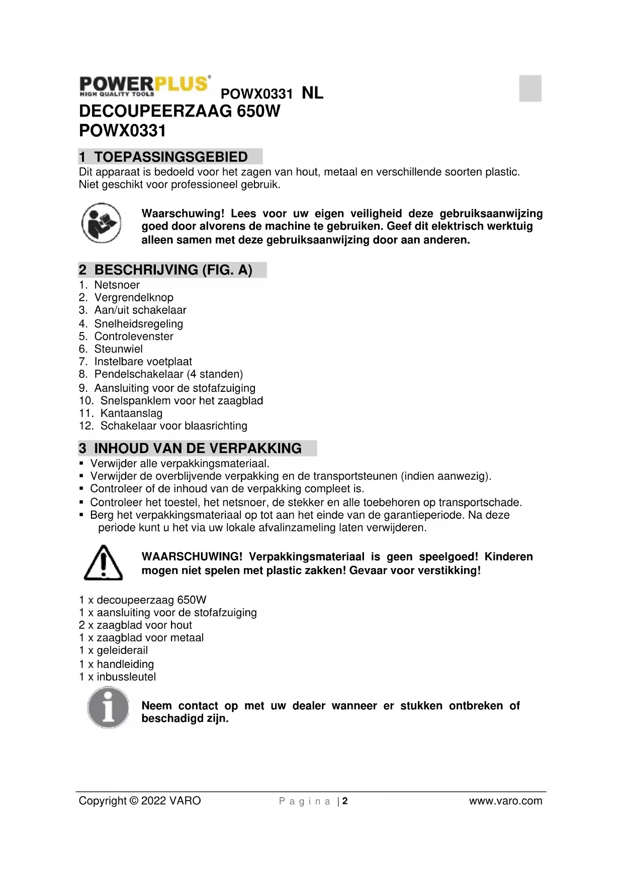 - Berg het verpakkingsmateriaal op tot aan het einde van de garantieperiode. Na deze periode kunt u het via uw lokale afvalinzameling laten verwijderen. WAARSCHUWING! Verpakkingsmateriaal is geen speelgoed! Kinderen mogen niet spelen met plastic zakken! Gevaar voor verstikking! 1 x decoupeerzaag 650W 1 x aansluiting voor de stofafzuiging 2 x zaagblad voor hout 1 x zaagblad voor metaal 1 x geleiderail 1 x handleiding 1 x inbussleutel Neem contact op met uw dealer wanneer er stukken ontbreken of beschadigd zijn.POWX0331 NL Copyright © 2022 VARO P a g i n a | 3 www.varo.com