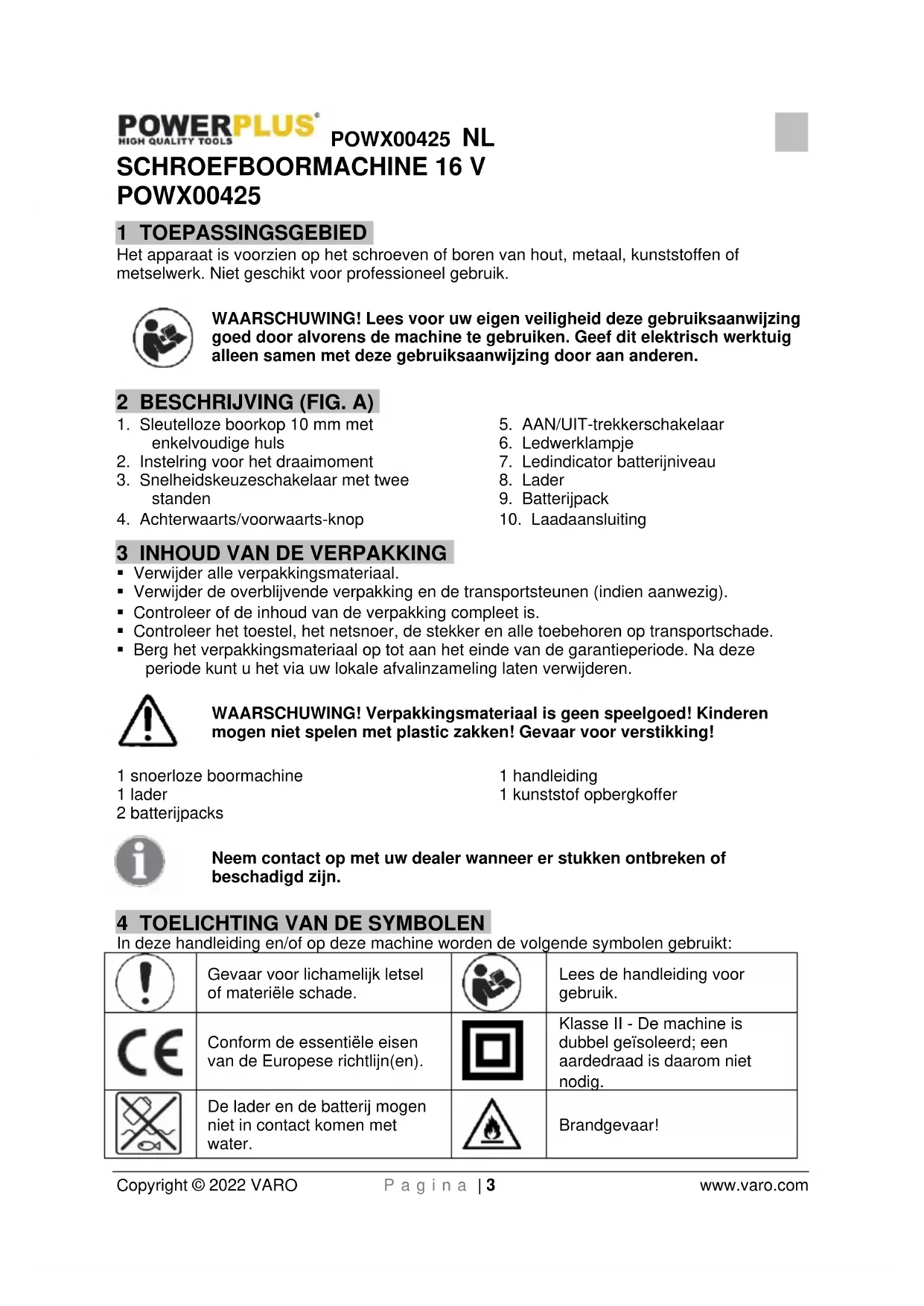 - Beperkte zelfontlading (zie ook het hoofdstuk: Opbergen).POWX00425 NL Copyright © 2022 VARO P a g i n a | 7 www.varo.com
