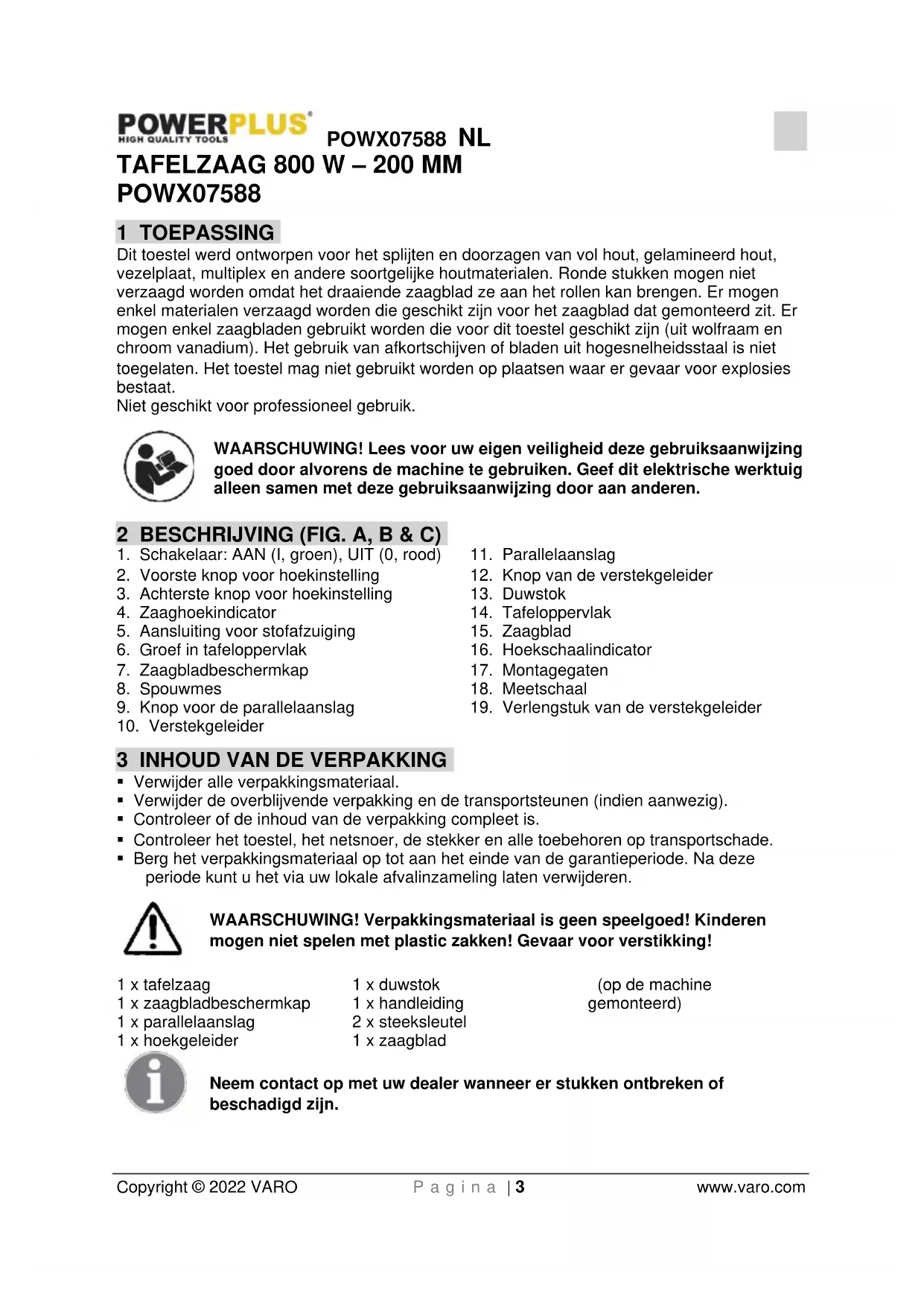 - Berg het verpakkingsmateriaal op tot aan het einde van de garantieperiode. Na deze periode kunt u het via uw lokale afvalinzameling laten verwijderen. WAARSCHUWING! Verpakkingsmateriaal is geen speelgoed! Kinderen mogen niet spelen met plastic zakken! Gevaar voor verstikking! 1 x tafelzaag 1 x zaagbladbeschermkap 1 x parallelaanslag 1 x hoekgeleider 1 x duwstok 1 x handleiding 2 x steeksleutel 1 x zaagblad (op de machine gemonteerd) Neem contact op met uw dealer wanneer er stukken ontbreken of beschadigd zijn.POWX07588 NL Copyright © 2022 VARO P a g i n a | 4 www.varo.com