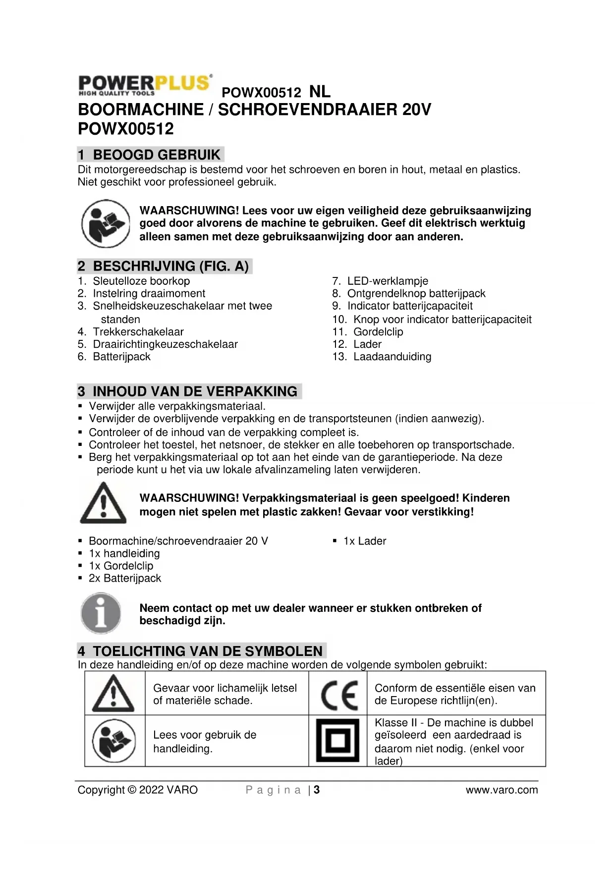 Klasse II - De machine is dubbel geïsoleerd een aardedraad is daarom niet nodig. (enkel voor lader)POWX00512 NL Copyright © 2022 VARO P a g i n a | 4 www.varo.com