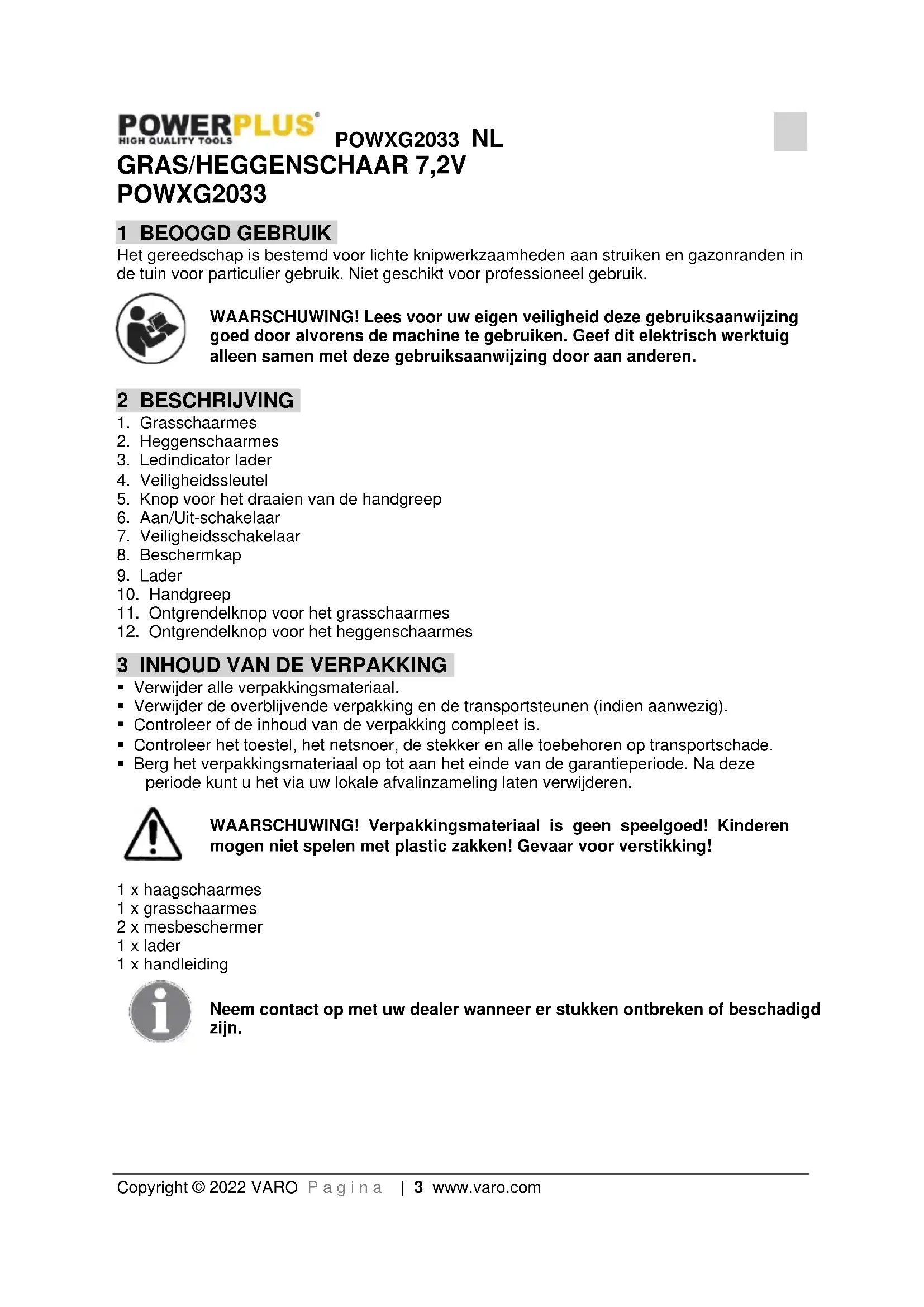 - Berg het verpakkingsmateriaal op tot aan het einde van de garantieperiode. Na deze periode kunt u het via uw lokale afvalinzameling laten verwijderen. WAARSCHUWING! Verpakkingsmateriaal is geen speelgoed! Kinderen mogen niet spelen met plastic zakken! Gevaar voor verstikking! 1 x haagschaarmes 1 x grasschaarmes 2 x mesbeschermer 1 x lader 1 x handleiding Neem contact op met uw dealer wanneer er stukken ontbreken of beschadigd zijn.POWXG2033 NL Copyright © 2022 VARO P a g i n a | 4 www.varo.com
