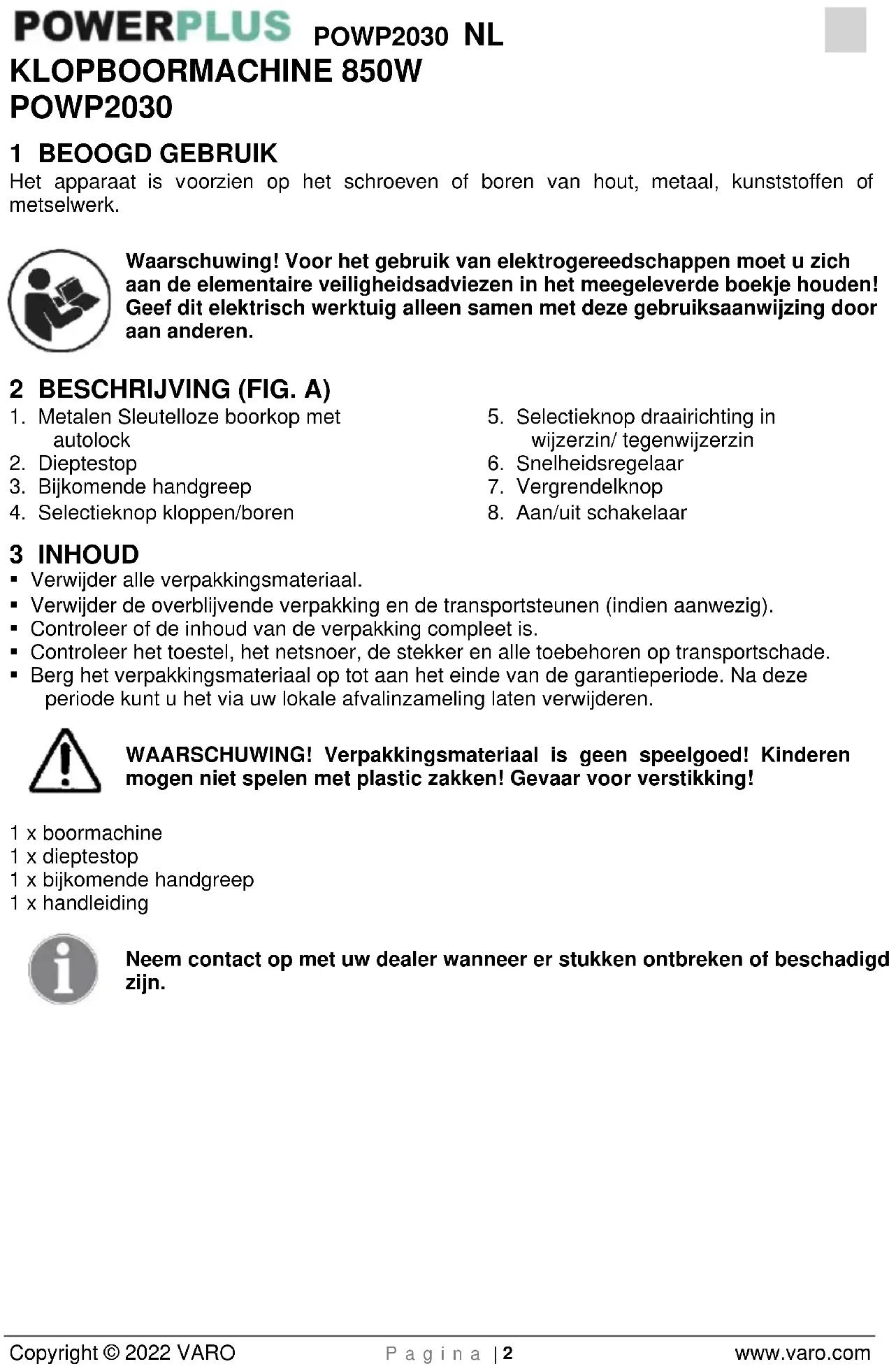 - Berg het verpakkingsmateriaal op tot aan het einde van de garantieperiode. Na deze periode kunt u het via uw lokale afvalinzameling laten verwijderen. WAARSCHUWING! Verpakkingsmateriaal is geen speelgoed! Kinderen mogen niet spelen met plastic zakken! Gevaar voor verstikking! 1 x boormachine 1 x dieptestop 1 x bijkomende handgreep 1 x handleiding Neem contact op met uw dealer wanneer er stukken ontbreken of beschadigd zijn.POWP2030 NL Copyright © 2022 VARO P a g i n a | 3 www.varo.com