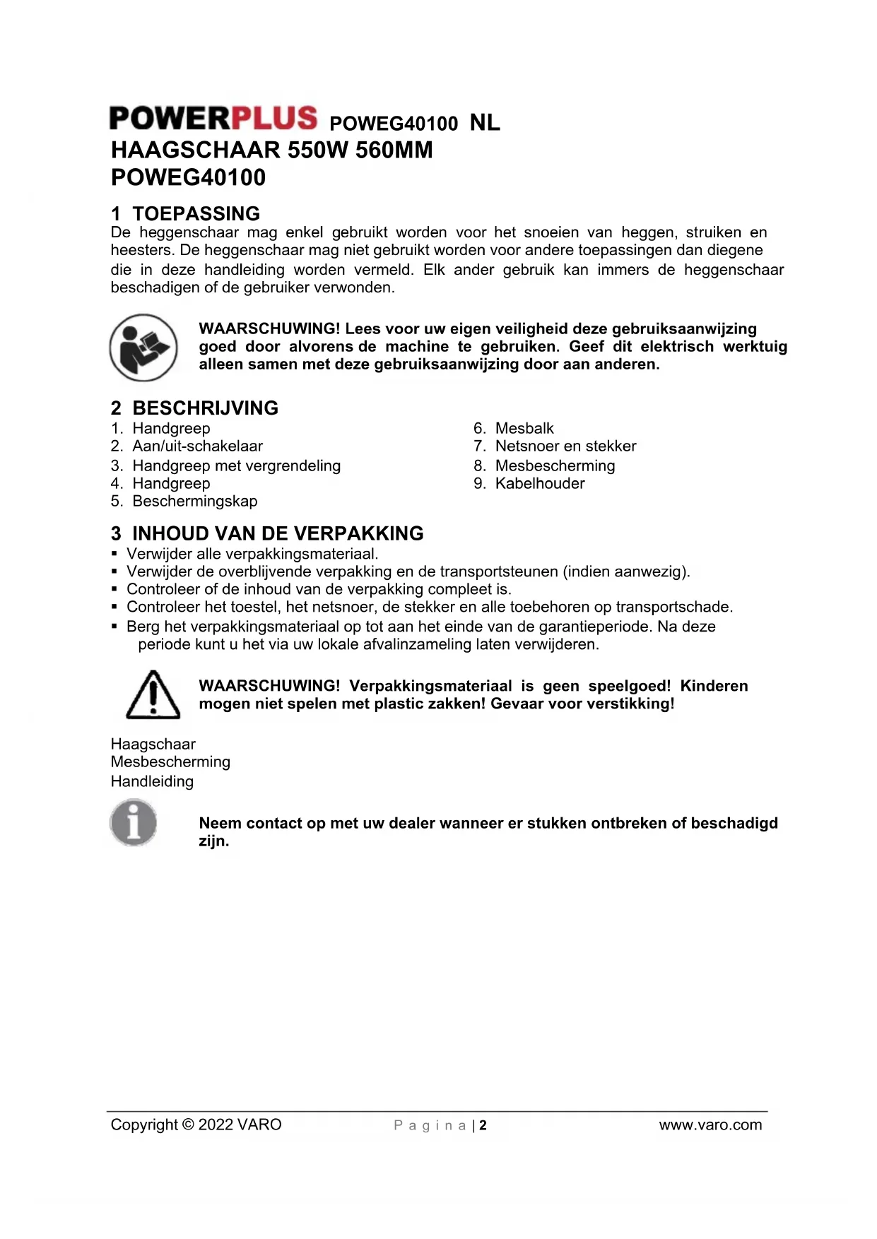 Verwijder alle verpakkingsmateriaal. Verwijder de overblijvende verpakking en de transportsteunen (indien aanwezig). Controleer of de inhoud van de verpakking compleet is. Controleer het toestel, het netsnoer, de stekker en alle toebehoren op transportschade. Berg het verpakkingsmateriaal op tot aan het einde van de garantieperiode. Na deze periode kunt u het via uw lokale afvalinzameling laten verwijderen. WAARSCHUWING! Verpakkingsmateriaal is geen speelgoed! Kinderen mogen niet spelen met plastic zakken! Gevaar voor verstikking! Haagschaar Mesbescherming Handleiding Neem contact op met uw dealer wanneer er stukken ontbreken of beschadigd zijn.POWEG40100 NL Copyright © 2022 VARO P a g i n a | 3 www.varo.com