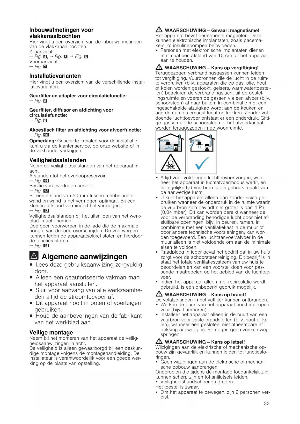 Algemene aanwijzingen ¡ Lees deze gebruiksaanwijzing zorgvuldig door. ¡ Alleen een geautoriseerde vakman mag het apparaat aansluiten. ¡ Sluit voor aanvang van alle werkzaamhe- den altijd de stroomtoevoer af. ¡ Dit apparaat nooit in boten of voertuigen gebruiken. ¡ Houd de aanbevelingen van de fabrikant van het werkblad aan. Veilige montage Neem bij het monteren van het apparaat de veilig- heidsaanwijzingen in acht. De veiligheid is alleen gewaarborgd bij een deskun- dige montage volgens de montagehandleiding. De installateur is verantwoordelijk voor een goede wer- king op de plaats van opstelling. WAARSCHUWING‒Gevaar: magnetisme! Het apparaat bevat permanente magneten. Deze kunnen elektronische implantaten, zoals pacema- kers, of insulinepompen beïnvloeden. ▶ Personen met elektronische implantaten dienen minimaal een afstand van 10 cm tot het apparaat aan te houden. WAARSCHUWING‒Kans op vergiftiging! Teruggezogen verbrandingsgassen kunnen leiden tot vergiftiging. Vuurbronnen die de lucht in de ruim- te verbruiken (bijv. apparaten die op gas, olie, hout of kolen worden gestookt, geisers, warmwatertoestel- len) betrekken de verbrandingslucht uit de opstel- lingsruimte en voeren de gassen via een afvoer (bijv. schoorsteen) af naar buiten. In combinatie met een ingeschakelde afzuigkap wordt aan de keuken en aan de ruimtes ernaast lucht onttrokken. Zonder vol- doende luchttoevoer ontstaat er een onderdruk. Gifti- ge gassen uit de schoorsteen of het afvoerkanaal worden teruggezogen in de woonruimte. ▶ Altijd voor voldoende luchttoevoer zorgen, wan- neer het apparaat in luchtafvoermodus werkt, en er tegelijkertijd vuurbron is die gebruik maakt van de aanwezige lucht. ▶ U kunt het apparaat alleen dan zonder risico ge- bruiken wanneer de onderdruk in de ruimte waarin de vuurbron zich bevindt niet groter is dan 4 Pa (0,04 mbar). Dit kan worden bereikt wanneer de voor de verbranding benodigde lucht door niet af- sluitbare openingen, bijv. in deuren, ramen, in combinatie met een ventilatiekast in de muur of door andere technische voorzieningen, kan wor- den toegevoerd. Een luchtaanvoer/afvoer in de muur alleen is niet voldoende om aan de minimale eisen te voldoen. ▶ Raadpleeg in ieder geval het bedrijf dat in uw huis zorgt voor de schoorsteenreiniging. Dit bedrijf is in staat het totale ventilatiesysteem van uw huis te beoordelen en kan een voorstel doen voor pas- sende maatregelen op het gebied van de luchttoe- voer. ▶ Indien het apparaat alleen met recirculatie wordt gebruikt, is een onbeperkt gebruik mogelijk. WAARSCHUWING‒Kans op brand! De vetafzettingen in het vetfilter kunnen ontbranden. ▶ Werk in de buurt van het apparaat nooit met open vuur (bijv. flamberen). ▶ Installeer het apparaat alleen in de buurt van een vuurbron voor vaste brandstoffen (bijv. hout of ko- len), wanneer een gesloten, niet afneembare af- dekking aanwezig is. Er mogen geen vonken weg- springen. WAARSCHUWING‒Kans op letsel! Wijzigingen aan de elektrische of mechanische op- bouw zijn gevaarlijk en kunnen leiden tot functiesto- ringen. ▶ Geen wijzigingen aan de elektrische of mechani- sche opbouw aanbrengen. Onderdelen die tijdens de montage toegankelijk zijn, kunnen scherp zijn en tot snijletsels leiden. ▶ Veiligheidshandschoenen dragen. Het toestel is zwaar. ▶ Om het apparaat te bewegen, zijn 2 personen ver- eist.34 ▶ Alleen geschikte hulpmiddelen gebruiken. WAARSCHUWING‒Kans op verstikking! Kinderen kunnen verpakkingsmateriaal over het hoofd trekken en hierin verstrikt raken en stikken. ▶ Verpakkingsmateriaal uit de buurt van kinderen houden. ▶ Laat kinderen niet met verpakkingsmateriaal spe- len. WAARSCHUWING‒Kans op vergiftiging! Teruggezogen verbrandingsgassen kunnen leiden tot vergiftiging. ▶ De luchtafvoer niet in een rookkanaal of rookgas- afvoer leiden dat in bedrijf is. ▶ Voer de luchtafvoer niet in een schacht die dient voor het ontluchten van opstelruimtes voor haar- den. ▶ Moet de luchtafvoer in een rook- of afvoergas- schoorsteen worden geleid die niet in gebruik is, dan dient hiervoor toestemming van een vakbe- kwame schoorsteenveger te worden verkregen. Teruggezogen verbrandingsgassen kunnen leiden tot vergiftiging. ▶ Wanneer een afzuigkap wordt geïnstalleerd met een haard die afhankelijk is van de ruimtelucht, dan moet de stroomtoevoer van de afzuigkap zijn voorzien van een geschikte veiligheidsschakeling. Aanwijzingen voor de elektrische aansluiting Om het apparaat elektrisch veilig te kunnen aanslui- ten, dient u deze aanwijzingen in acht te nemen. WAARSCHUWING‒Kans op elektrische schok! Het apparaat moet op elk gewenst moment van de stroom kunnen worden afgesloten. Het apparaat mag alleen op een geaard stopcontact worden aan- gesloten die volgens de voorschriften is geïnstal- leerd. ▶ In de vast geplaatste elektrische installatie moet een alpolige scheidingsinrichting volgens de voor- waarden van de overspanningscategorie III en vol- gens de opbouwvoorschriften worden ingebouwd. ▶ De vaste aansluiting mag alleen door een elektri- cien worden aangelegd. Wij adviseren een aard- lekschakelaar (FI-schakelaar) in de stroomkring naar het apparaat te installeren. ¡ De aansluitkabel niet knikken of inklemmen en uit de buurt van scherpe randen houden. ¡ De aansluitkabel zodanig plaatsen dat deze de he- te behuizing van het apparaat niet raakt. ¡ Alleen de bij het apparaat meegeleverde of door de technische servicedienst geleverde aansluitka- bel gebruiken. ¡ Dit apparaat voldoet aan de ontstoringsvoorschrif- ten van de EG. ¡ Het apparaat is conform de beschermingsklasse
