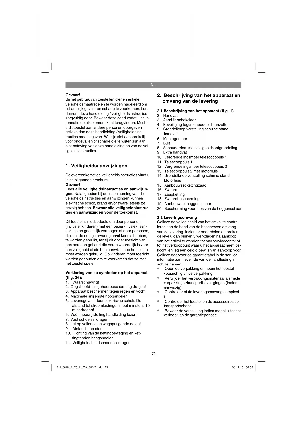 Bewaar de verpakking indien mogelijk tot het verloop van de garantieperiode. Anl_GHH_E_20_Li_OA_SPK7.indb 79Anl_GHH_E_20_Li_OA_SPK7.indb 79 06.11.15 06:5506.11.15 06:55NL