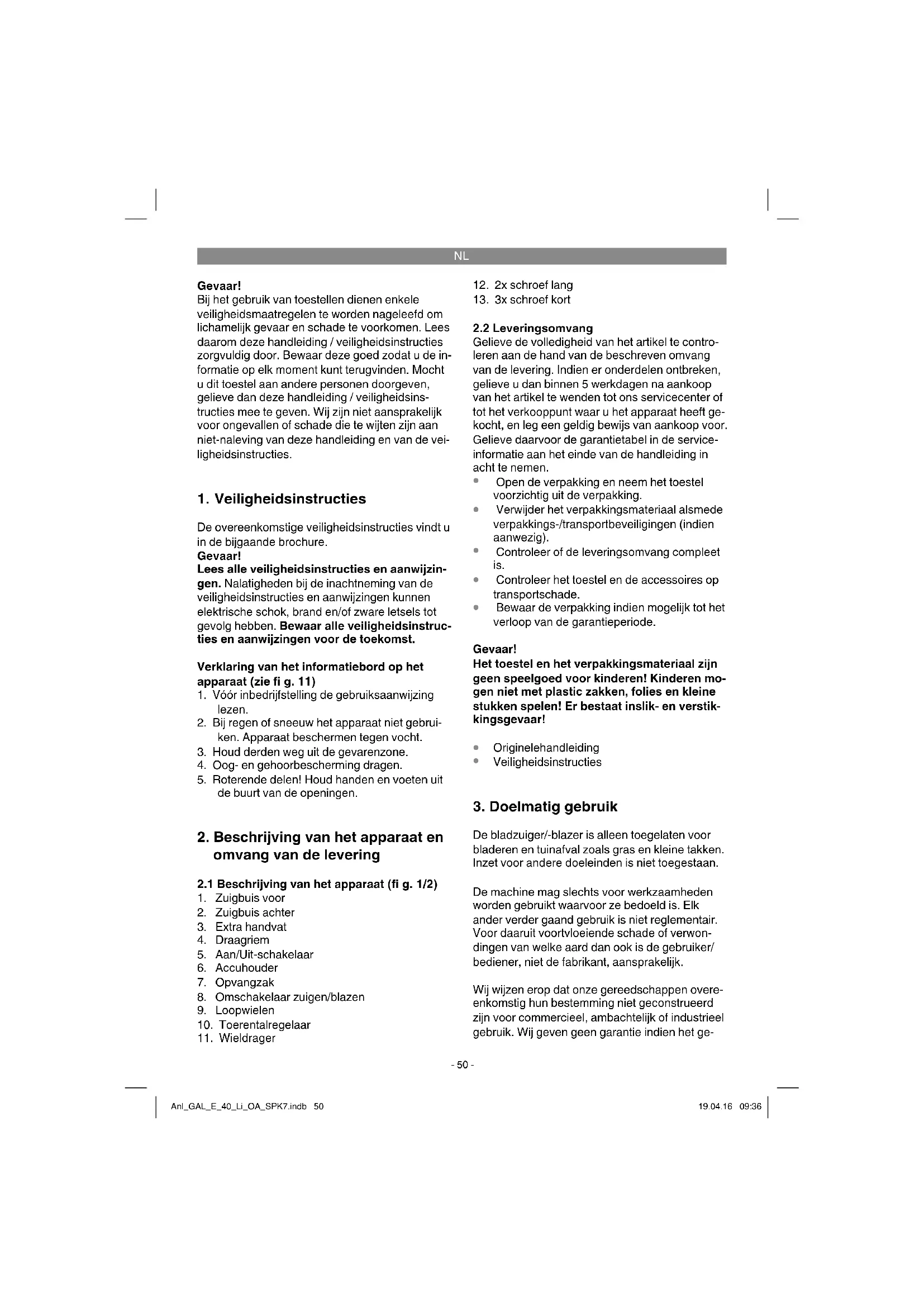 De bladzuiger/-blazer is alleen toegelaten voor bladeren en tuinafval zoals gras en kleine takken. Inzet voor andere doeleinden is niet toegestaan. De machine mag slechts voor werkzaamheden worden gebruikt waarvoor ze bedoeld is. Elk ander verder gaand gebruik is niet reglementair. Voor daaruit voortvloeiende schade of verwon- dingen van welke aard dan ook is de gebruiker/ bediener, niet de fabrikant, aansprakelijk. Wij wijzen erop dat onze gereedschappen overe- enkomstig hun bestemming niet geconstrueerd zijn voor commercieel, ambachtelijk of industrieel gebruik. Wij geven geen garantie indien het ge- Anl_GAL_E_40_Li_OA_SPK7.indb 50Anl_GAL_E_40_Li_OA_SPK7.indb 50 19.04.16 09:3619.04.16 09:36NL