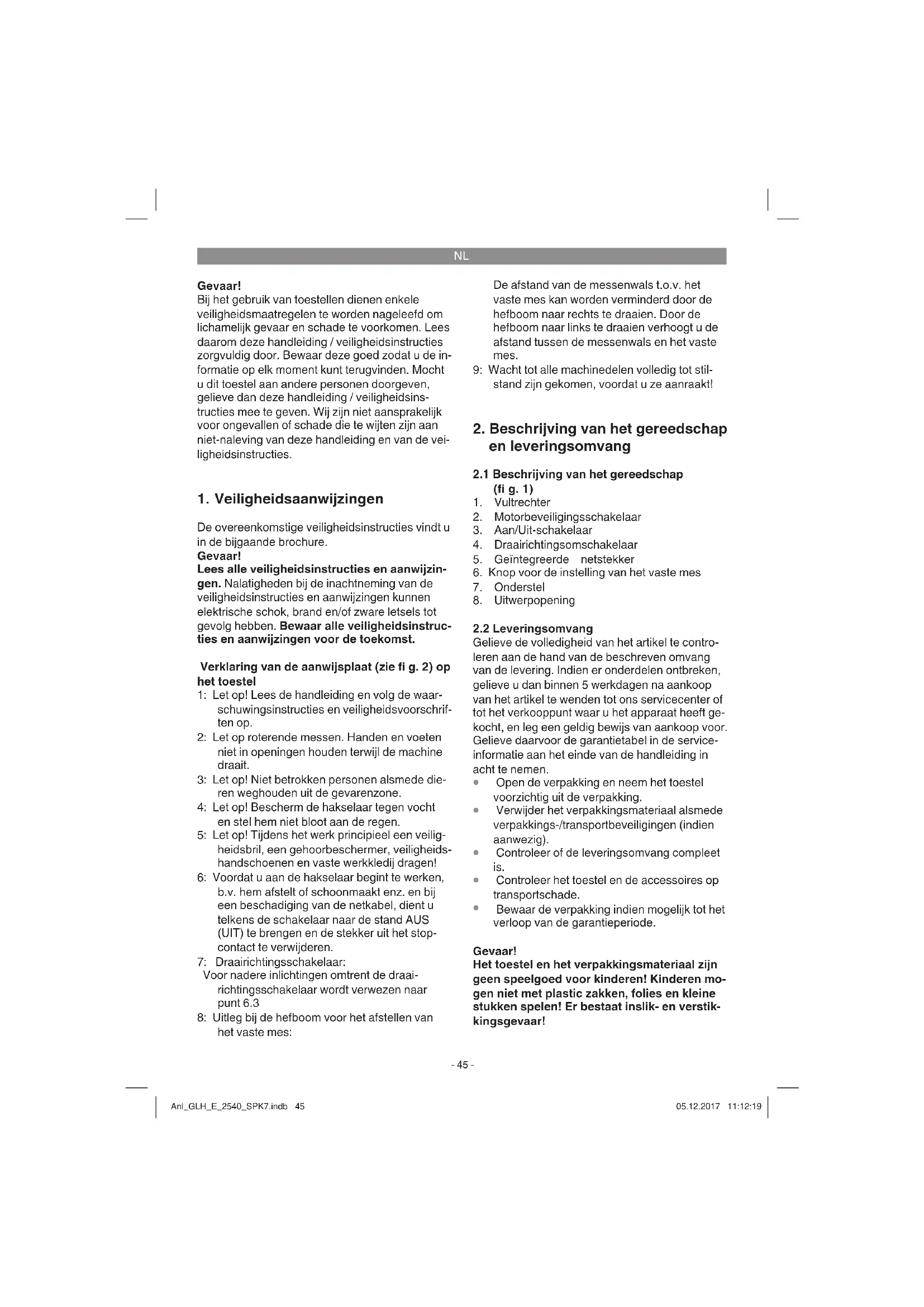 Bewaar de verpakking indien mogelijk tot het verloop van de garantieperiode. Gevaar! Het toestel en het verpakkingsmateriaal zijn geen speelgoed voor kinderen! Kinderen mo- gen niet met plastic zakken, folies en kleine stukken spelen! Er bestaat inslik- en verstik- kingsgevaar! Anl_GLH_E_2540_SPK7.indb 45Anl_GLH_E_2540_SPK7.indb 45 05.12.2017 11:12:1905.12.2017 11:12:19NL