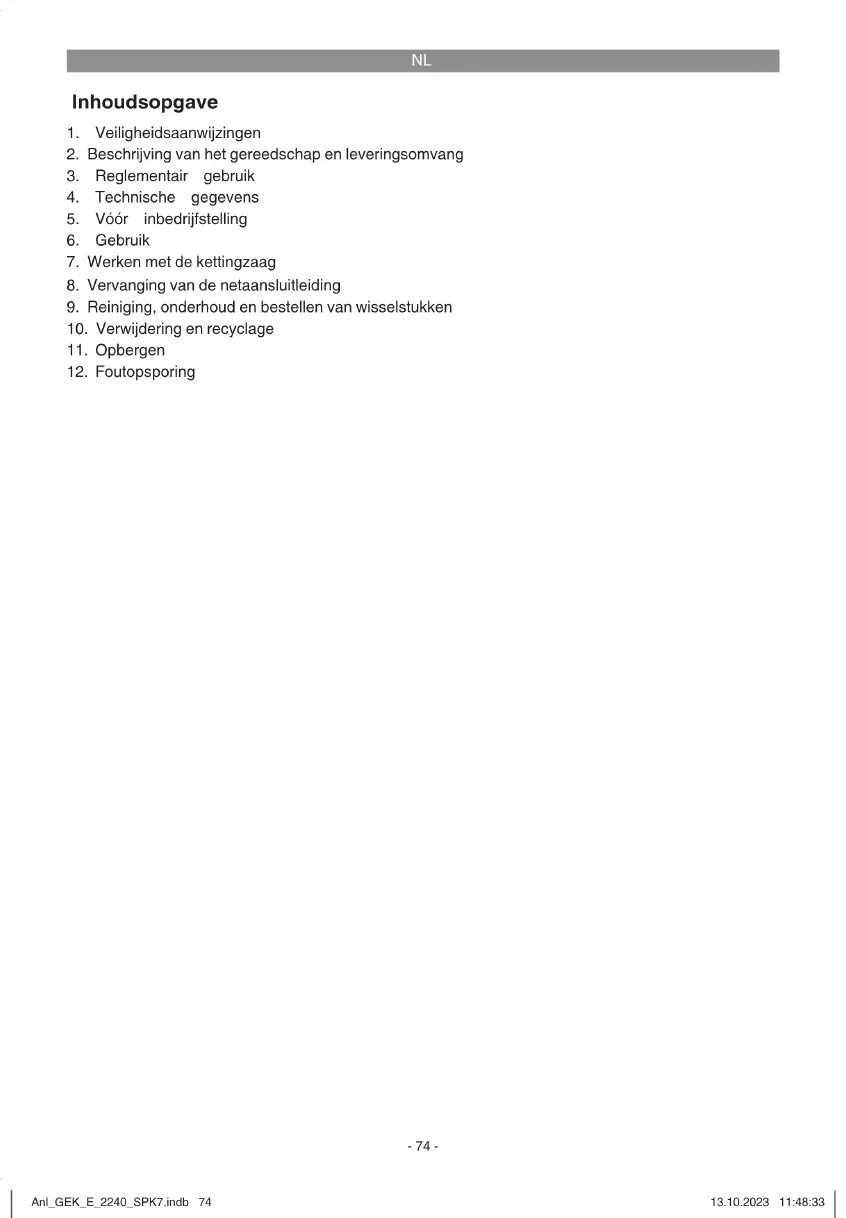 Controleer voor elk gebruik volgende punten om veilig te kunnen werken: Toestand van de kettingzaag Ga voor werkbegin na of de behuizing, de netkabel, de zaagketting of het zwaard van de kettingzaag beschadigd zijn. Neem nooit een ge- reedschap in gebruik dat blijkbaar beschadigd is. Olietank Oliepeil van de tank. Controleer ook tijdens het werk of er steeds voldoende olie voorhanden is. Werk nooit met de zaag als er geen olie voorhan- den is of als het oliepeil onder het minimummerk is gezakt (fi g. 10, pos. B) om een beschadiging Anl_GEK_E_2240_SPK7.indb 78Anl_GEK_E_2240_SPK7.indb 78 13.10.2023 11:48:3413.10.2023 11:48:34NL
