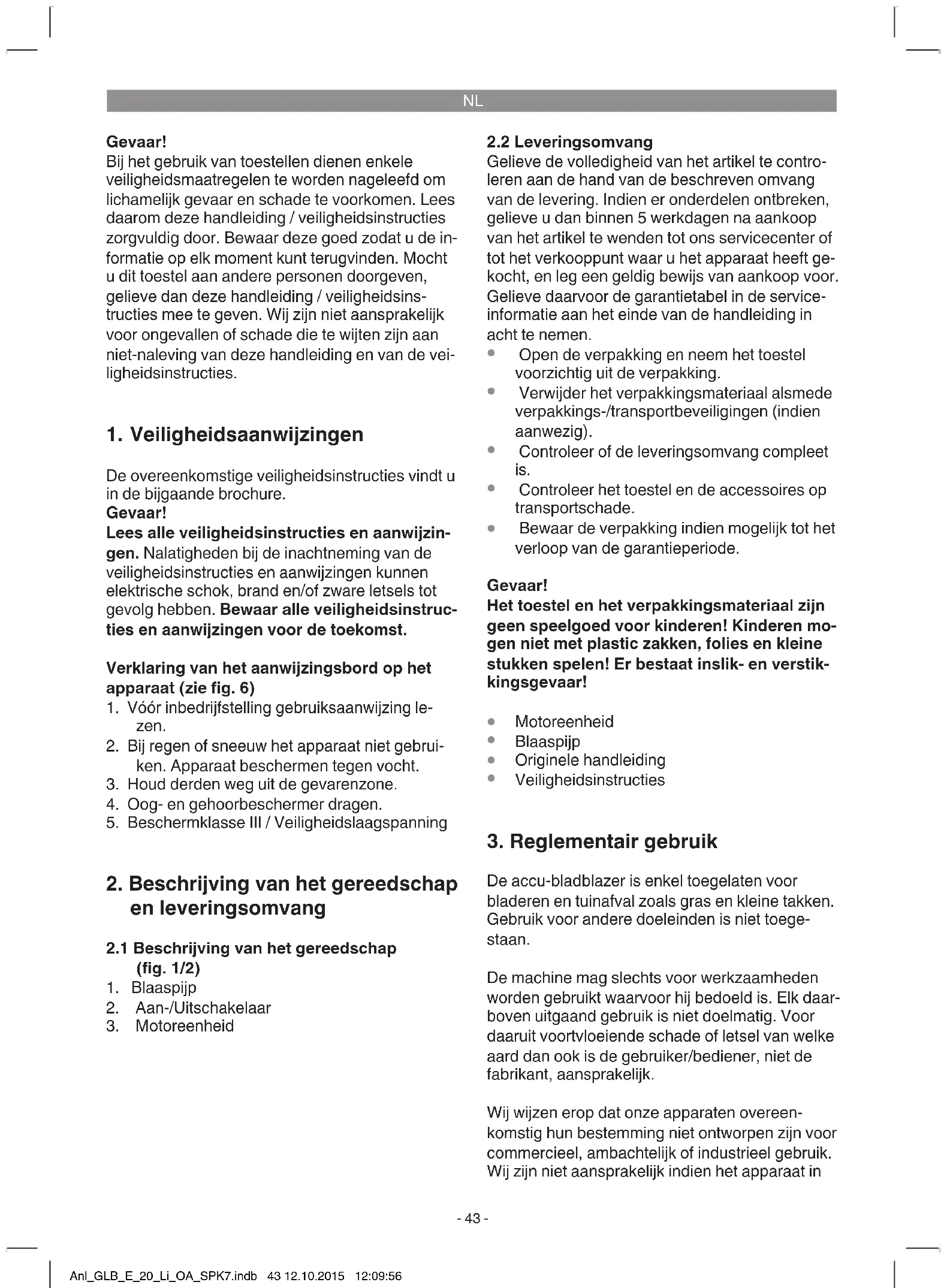 De accu-bladblazer is enkel toegelaten voor bladeren en tuinafval zoals gras en kleine takken. Gebruik voor andere doeleinden is niet toege- staan. De machine mag slechts voor werkzaamheden worden gebruikt waarvoor hij bedoeld is. Elk daar- boven uitgaand gebruik is niet doelmatig. Voor daaruit voortvloeiende schade of letsel van welke aard dan ook is de gebruiker/bediener, niet de fabrikant, aansprakelijk. Wij wijzen erop dat onze apparaten overeen- komstig hun bestemming niet ontworpen zijn voor commercieel, ambachtelijk of industrieel gebruik. Wij zijn niet aansprakelijk indien het apparaat in Anl_GLB_E_20_Li_OA_SPK7.indb 43 12.10.2015 12:09:56NL