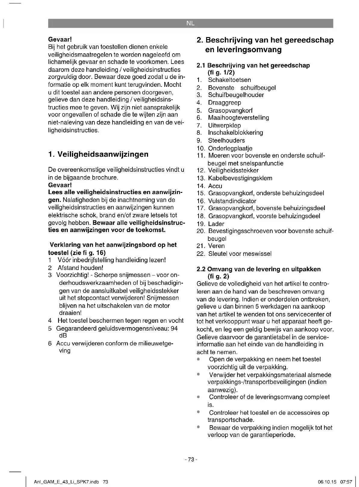 Richt de kabel uit met de bevestigingsklem- men aan de geleidesteel (fig. 7, pos. A). Montage van de opvangkorf (zie fi g. 8 tot 10) Steek eerst het onderste behuizingsdeel (fi g. 2, pos. 15) en het voorste behuizingsdeel (fi g. 2, pos. 18) in elkaar zoals getoond in fi g. 8. Vervol- gens steekt u het bovenste behuizingsdeel (fi g. 2, pos 17) op de reeds gemonteerde helften (fi g. 9). Om de opvangkorf in te hangen moet de motor worden uitgeschakeld en mag het snijmes niet draaien. Uitwerpklep (fi g. 10, pos. A) met één hand optillen. Met de andere hand de opvangkorf aan de handgreep vasthouden en van boven in- hangen (fi g. 10). Vulstandindicator opvanginrichting De opvanginrichting bezit een vulstandindicator (fi g. 2, pos. 16). Deze wordt geopend door de luchtstroom, die de maaier tijdens het bedrijf ge- nereert. Als de klep tijdens het maaien dichtvalt, dan is de opvanginrichting vol en moet hij worden leeggemaakt. Voor een foutloze werking van de vulstandindicator moeten de gaten onder de klep altijd schoon en doorlatend zijn. Verstelling van de maaihoogte Let op! Het verstellen van de maaihoogte mag alleen worden uitgevoerd bij uitgeschakelde motor en uit het stopcontact getrokken veiligheidsstekker. Voordat u begint te maaien controleert u of het maaigereedschap niet bot is, en of de beves- tigingsmiddelen niet zijn beschadigd. Vervang botte en/of beschadigde maaigereedschappen om onbalans te vermijden. Bij deze controle de motor afzetten en de veiligheidsstekker uit het stopcontact trekken. Anl_GAM_E_43_Li_SPK7.indb 75Anl_GAM_E_43_Li_SPK7.indb 75 06.10.15 07:5706.10.15 07:57NL