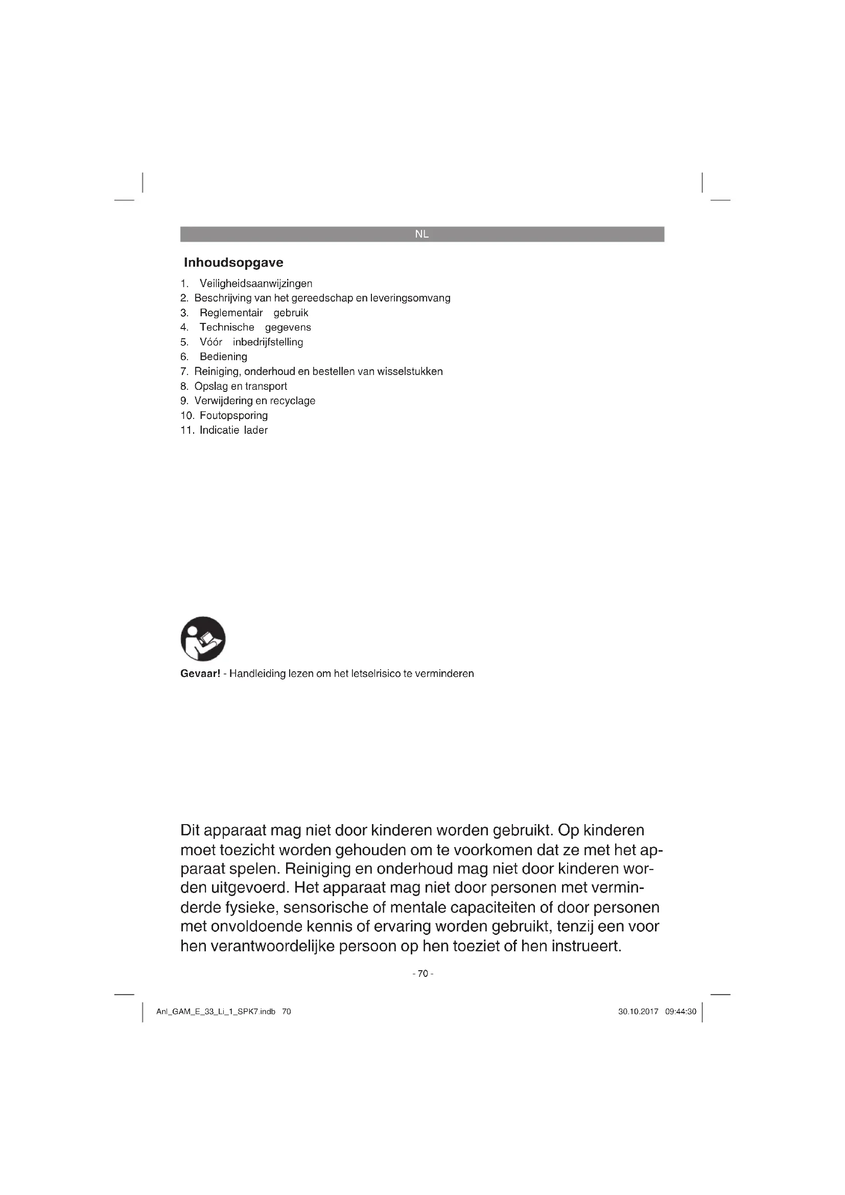 Dit apparaat mag niet door kinderen worden gebruikt. Op kinderen moet toezicht worden gehouden om te voorkomen dat ze met het ap- paraat spelen. Reiniging en onderhoud mag niet door kinderen wor- den uitgevoerd. Het apparaat mag niet door personen met vermin- derde fysieke, sensorische of mentale capaciteiten of door personen met onvoldoende kennis of ervaring worden gebruikt, tenzij een voor hen verantwoordelijke persoon op hen toeziet of hen instrueert. Gevaar! - Handleiding lezen om het letselrisico te verminderen Anl_GAM_E_33_Li_1_SPK7.indb 70Anl_GAM_E_33_Li_1_SPK7.indb 70 30.10.2017 09:44:3030.10.2017 09:44:30NL
