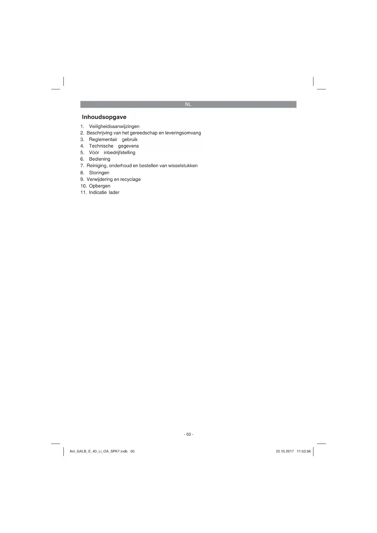 Enkel voor EU-landen Elektrisch gereedschap hoort niet bij het huisvuil thuis! Volgens de Europese richtlijn 2012/19/EG op afgedankte elektrische en elektronische toestellen en omzetting in nationaal recht dienen afgedankte elektrische gereedschappen afzonderlijk te worden ver- zameld en milieuvriendelijk te worden gerecycleerd. Recyclagealternatief i.p.v. het toestel terug te sturen: De eigenaar van het elektrische toestel is alternatief verplicht, i.p.v. het toestel terug te sturen, mede te werken bij de behoorlijke recyclage in geval hij zich van het eigendom ontdoet. Het afgedankte toestel kan hiervoor ook bij een verzamelplaats worden afgegeven die voor een verwijdering als bedoeld in de wetgeving in zake recyclage en afvalverwerking zorgt. Hieronder vallen niet bij de afgedankte toestellen gevoegde accessoires en hulpmiddelen zonder elektrische componenten. Nadruk of andere reproductie van documentatie en geleidepapieren van de producten, geheel of ge- deeltelijk, enkel toegestaan mits uitdrukkelijke toestemming van iSC GmbH. Technische wijzigingen voorbehouden Anl_GALB_E_40_Li_OA_SPK7.indb 56Anl_GALB_E_40_Li_OA_SPK7.indb 56 20.10.2017 11:53:5620.10.2017 11:53:56NL