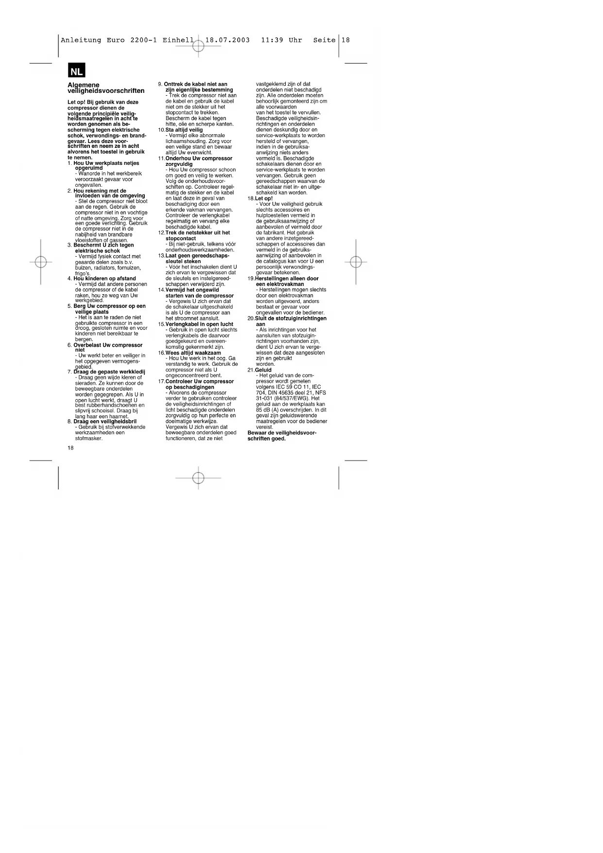 Anleitung Euro 2200-1 Einhell 18.07.2003 11:39 Uhr Seite 1718 Algemene veiligheidsvoorschriften Let op! Bij gebruik van deze compressor dienen de volgende principiële veilig- heidsmaatregelen in acht te worden genomen als be- scherming tegen elektrische schok, verwondings- en brand- gevaar. Lees deze voor- schriften en neem ze in acht alvorens het toestel in gebruik te nemen.