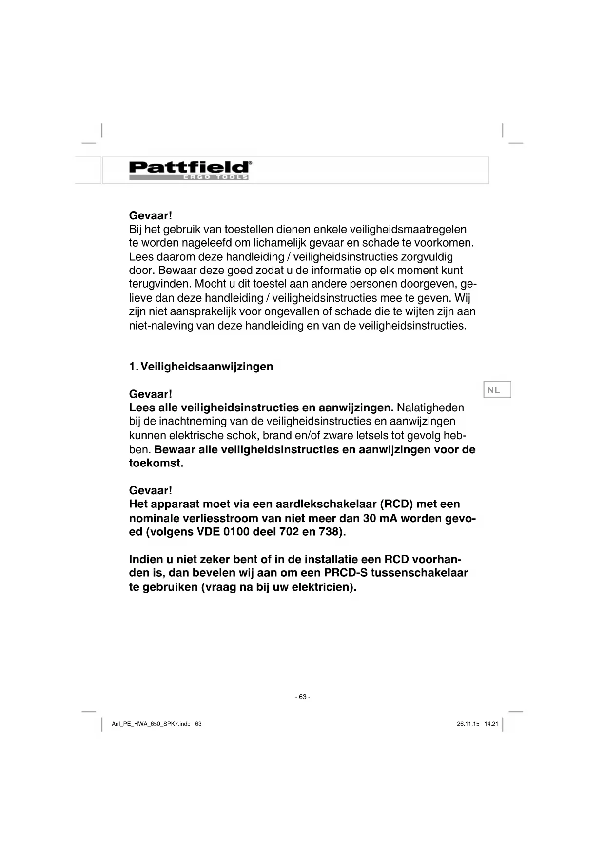Gevaar! Lees alle veiligheidsinstructies en aanwijzingen. Nalatigheden bij de inachtneming van de veiligheidsinstructies en aanwijzingen kunnen elektrische schok, brand en/of zware letsels tot gevolg heb- ben. Bewaar alle veiligheidsinstructies en aanwijzingen voor de toekomst. Gevaar! Het apparaat moet via een aardlekschakelaar (RCD) met een nominale verliesstroom van niet meer dan 30 mA worden gevo- ed (volgens VDE 0100 deel 702 en 738). Indien u niet zeker bent of in de installatie een RCD voorhan- den is, dan bevelen wij aan om een PRCD-S tussenschakelaar te gebruiken (vraag na bij uw elektricien). Anl_PE_HWA_650_SPK7.indb 63Anl_PE_HWA_650_SPK7.indb 63 26.11.15 14:2126.11.15 14:21NL