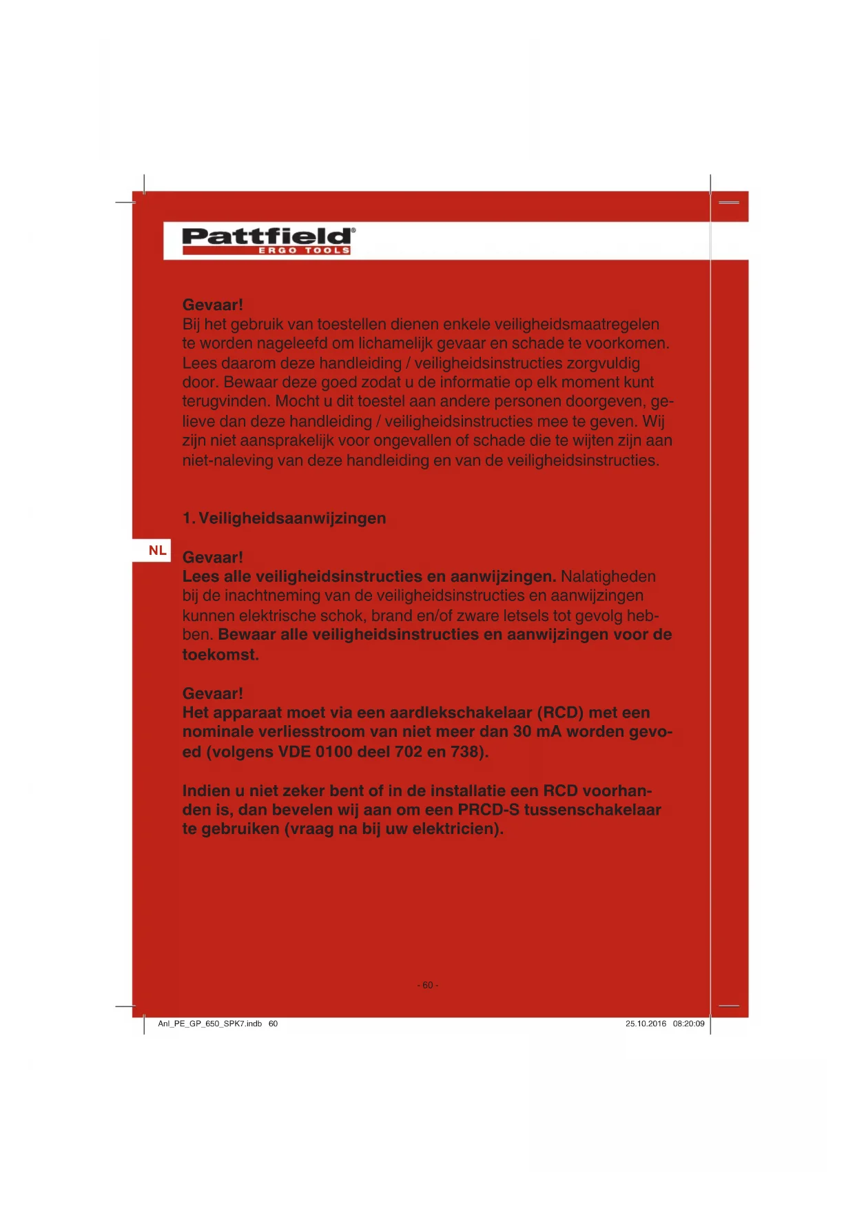 Gevaar! Lees alle veiligheidsinstructies en aanwijzingen. Nalatigheden bij de inachtneming van de veiligheidsinstructies en aanwijzingen kunnen elektrische schok, brand en/of zware letsels tot gevolg heb- ben. Bewaar alle veiligheidsinstructies en aanwijzingen voor de toekomst. Gevaar! Het apparaat moet via een aardlekschakelaar (RCD) met een nominale verliesstroom van niet meer dan 30 mA worden gevo- ed (volgens VDE 0100 deel 702 en 738). Indien u niet zeker bent of in de installatie een RCD voorhan- den is, dan bevelen wij aan om een PRCD-S tussenschakelaar te gebruiken (vraag na bij uw elektricien). Anl_PE_GP_650_SPK7.indb 60Anl_PE_GP_650_SPK7.indb 60 25.10.2016 08:20:0925.10.2016 08:20:09NL