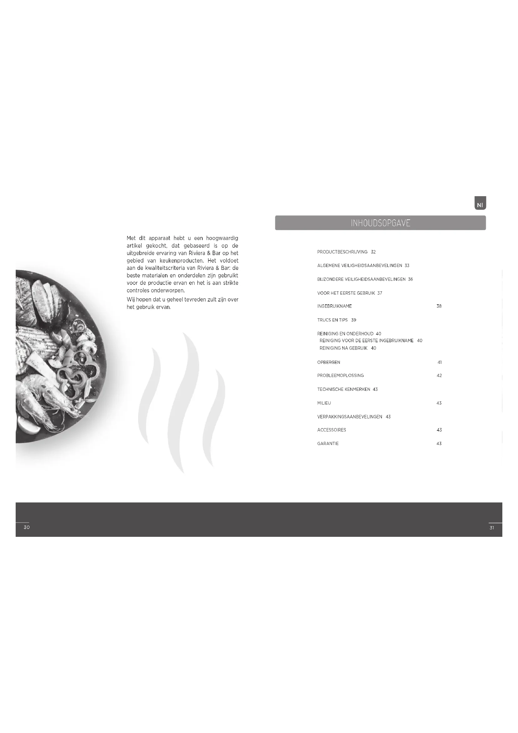 Met dit apparaat hebt u een hoogwaardig artikel gekocht, dat gebaseerd is op de uitgebreide ervaring van Riviera & Bar op het gebied van keukenproducten. Het voldoet aan de kwaliteitscriteria van Riviera & Bar: de beste materialen en onderdelen zijn gebruikt voor de productie ervan en het is aan strikte controles onderworpen. Wij hopen dat u geheel tevreden zult zijn over het gebruik ervan. PRODUCTBESCHRIJVING 32 ALGEMENE VEILIGHEIDSAANBEVELINGEN 33 BIJZONDERE VEILIGHEIDSAANBEVELINGEN 36