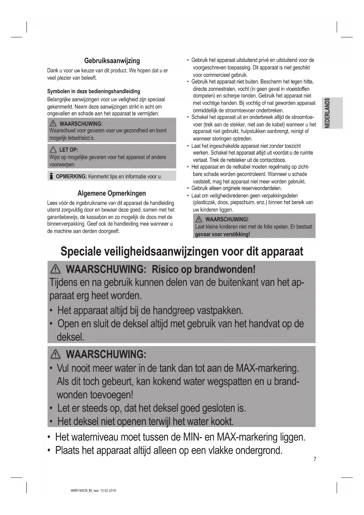 Technische gegevens Model: ................................................................WKR 1162 CB Spanningstoevoer: ................................120 / 230 V~, 50 / 60 Hz Opgenomen vermogen: ................................................ 1000 W Beschermingsklasse: .............................................................. I Volume: ..............................................................0,1 - max. 0,5 l Nettogewicht: .........................................................ong. 0,52 kg Het recht om technische en ontwerpaanpassingen te maken in de loop van voortdurende productontwikkeling blijft voorbehouden. Dit apparaat is gekeurd conform de op dit moment van toepassing zijnde CE-richtlijnen zoals bijvoorbeeld elektro- magnetische compatibiliteit en laagspanningsvoorschriften en is geconstrueerd volgens de nieuwste veiligheidstechnische voorschriften.11 WKR1162CB_IM_new 10.02.2016 Verwijdering Betekenis van het symbool “vuilnisemmer” Bescherm ons milieu, elektrische apparaten horen niet in het huisafval. Maak voor het afvoeren van elektrische appara- ten gebruik van de voorgeschreven verzamel- punten en geef daar de elektrische apparaten af die u niet meer gebruikt. Daardoor helpt u de potentiële effecten te voorkomen die een verkeerde afvoer op het milieu en de menselijke gezondheid kunnen hebben. Op deze wijze levert u uw bijdrage aan het hergebruik, de recycling en andere verwerkingsvormen voor oude elektroni- sche en elektrische apparaten. Voor informatie over verzamelpunten voor uw apparaten kunt u contact opnemen met uw gemeente of gemeenteadminis- tratie.12 WKR1162CB_IM_new 10.02.2016 Mode d’emploi Merci d’avoir choisi notre produit. Nous espérons que vous saurez proter votre appareil. Symboles de ce mode d’emploi Les informations importantes pour votre sécurité sont particu lièrement indiquées. Veillez à bien respecter ces indications ain d’éviter tout risque d’accident ou d’endommagement de l’appareil :