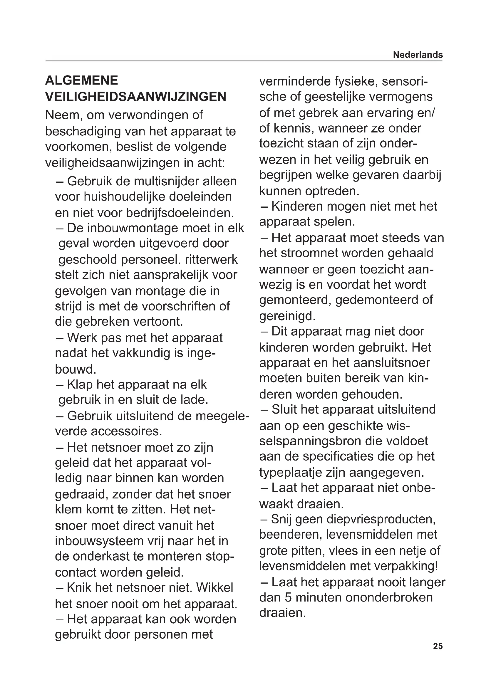 Este aparato cumple con las siguientes directivas y normas: – 2004/108/CE – 2006/95/CE – 1935/2004/CE – EuP 2009/125/CE – 2011/65/UE De este modo, el aparato cum- ple con las normas CE. Tensión de red/Consumo de potencia: ver placa de identi- cación en la parte inferior del aparato Grosor de corte: 0 mm hasta unos 14 mm GARANTÍA Este aparato ritter tiene una garantía del fabricante de 2 años, que empieza a contar a partir de la fecha de compra y es conforme a las directivas de garantía de la UE.¡En caso de reclamación de garantía o reparación, envíe el aparato, como regla general, al servicio de atención al cliente de su país! Español25 ALGEMENE VEILIGHEIDSAANWIJZINGEN Neem, om verwondingen of beschadiging van het apparaat te voorkomen, beslist de volgende veiligheidsaanwijzingen in acht: – Gebruik de multisnijder alleen voor huishoudelijke doeleinden en niet voor bedrijfsdoeleinden. – De inbouwmontage moet in elk geval worden uitgevoerd door geschoold personeel. ritterwerk stelt zich niet aansprakelijk voor gevolgen van montage die in strijd is met de voorschriften of die gebreken vertoont. – Werk pas met het apparaat nadat het vakkundig is inge- bouwd. – Klap het apparaat na elk gebruik in en sluit de lade. – Gebruik uitsluitend de meegele- verde accessoires. – Het netsnoer moet zo zijn geleid dat het apparaat vol- ledig naar binnen kan worden gedraaid, zonder dat het snoer klem komt te zitten. Het net- snoer moet direct vanuit het inbouwsysteem vrij naar het in de onderkast te monteren stop- contact worden geleid. – Knik het netsnoer niet. Wikkel het snoer nooit om het apparaat. – Het apparaat kan ook worden gebruikt door personen met verminderde fysieke, sensori- sche of geestelijke vermogens of met gebrek aan ervaring en/ of kennis, wanneer ze onder toezicht staan of zijn onder- wezen in het veilig gebruik en begrijpen welke gevaren daarbij kunnen optreden. – Kinderen mogen niet met het apparaat spelen. – Het apparaat moet steeds van het stroomnet worden gehaald wanneer er geen toezicht aan- wezig is en voordat het wordt gemonteerd, gedemonteerd of gereinigd. – Dit apparaat mag niet door kinderen worden gebruikt. Het apparaat en het aansluitsnoer moeten buiten bereik van kin- deren worden gehouden. – Sluit het apparaat uitsluitend aan op een geschikte wis- selspanningsbron die voldoet aan de specicaties die op het typeplaatje zijn aangegeven. – Laat het apparaat niet onbe- waakt draaien. – Snij geen diepvriesproducten, beenderen, levensmiddelen met grote pitten, vlees in een netje of levensmiddelen met verpakking! – Laat het apparaat nooit langer dan 5 minuten ononderbroken draaien. Nederlands26 Gevaar voor een elektrische schok – Haal de netstekker altijd uit het stopcontact bij bedrijfsstorin- gen, vóór elke reiniging en als het apparaat niet in gebruik is. Trek daarbij aan de stekker en niet aan het snoer. – Dompel het apparaat nooit onder in water. Stel het appa- raat nooit bloot aan regen of ander vocht. Als het apparaat toch in het water is gevallen, haal dan eerst de netstekker uit het stopcontact en haal pas dan het apparaat uit het water. Laat het apparaat daarna door een bevoegde servicedienst con- troleren voordat u het weer in gebruik neemt. – Gebruik het apparaat niet met vochtige handen. Gebruik het niet als het vochtig of nat is of als u op een natte vloer staat. Gebruik het apparaat niet in de open lucht. – Stel het apparaat bij bescha- diging van onderdelen onmid- dellijk buiten werking. Stuur het complete apparaat op naar de ritter-klantenservice. – Als het netsnoer wordt bescha- digd, moet dit door de fabrikant, zijn klantenservice of anders- zins gekwaliceerde personen worden vervangen om gevaar- lijke situaties te voorkomen. Verwondingsgevaar – Dit apparaat mag niet worden gebruikt zonder snijwaren- slede of restenhouder, tenzij de grootte of vorm van het te snij- den voedsel het gebruik ervan niet toelaat. – Voordat u accessoires of extra onderdelen die tijdens het gebruik bewegen, vervangt, dient u het apparaat uit te schakelen. – Het ronde mes is zeer scherp. – Raak bij werking van het apparaat het ronde mes in geen geval aan! – Voordat u gaat schoonmaken, dient u het apparaat uit te schakelen, de netstekker uit het stopcontact te halen en de snijdikteknop in de "0"-stand te draaien. – Het ronde mes staat na uit- schakeling niet onmiddellijk stil. Nederlands27 Vouw de tekeningen aan de binnenzijde van de voor- en achterkaft van de gebruiksaan- wijzing open. Lees de gebruiksaanwijzing vóór ingebruikneming van het apparaat zorgvuldig door. Bewaar de gebruiksaanwijzing en geef deze mee als het appa- raat van eigenaar verandert. Daarnaast is deze gebruiks- aanwijzing ook beschikbaar onder www.ritterwerk.de. BEOOGD GEBRUIK De multisnijder dient voor het snijden van levensmiddelen voor huishoudelijk gebruik. Niet-beoogd gebruik of onjuiste bediening kan leiden tot ernstige verwondingen of beschadiging van het apparaat. Hierbij vervallen alle rechten op garantie en aansprakelijkheid. INGEBRUIKNEMING Voorbereiding Laat het apparaat voor de eerste ingebruikneming door een vakman inbouwen in een geschikte lade. Maak het apparaat schoon voordat het in aanraking komt met levensmiddelen (zie REINIGEN). Apparaat plaatsen