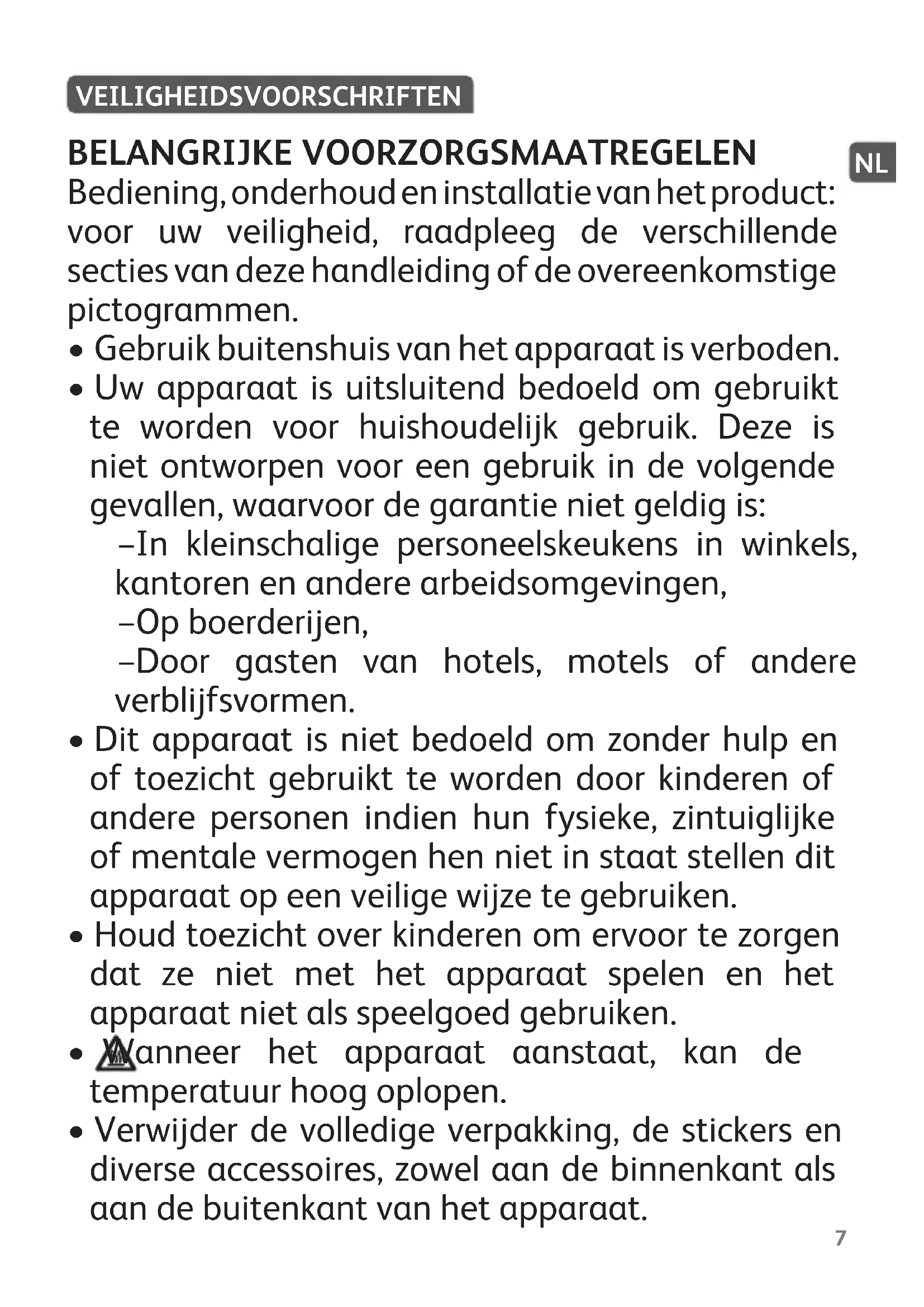 - Dit apparaat mag gebruikt worden door kinderen vanaf 8 jaar en door personen met beperkte fysieke, zintuiglijke of mentale capaciteiten of personen zonder ervaring of kennis, indien ze via een persoon die verantwoordelijk is voor hun veiligheid onder toezicht staan of voorafgaand 8NL instructies kregen over het gebruik van het toestel en op de hoogte zijn van de mogelijke risico’s. Schoonmaak en onderhoudswerkzaamheden mogen alleen worden verricht door kinderen boven de 8 jaar die onder toezicht staan. Houd het apparaat en diens snoer buiten bereik van kinderen onder de 8 jaar.