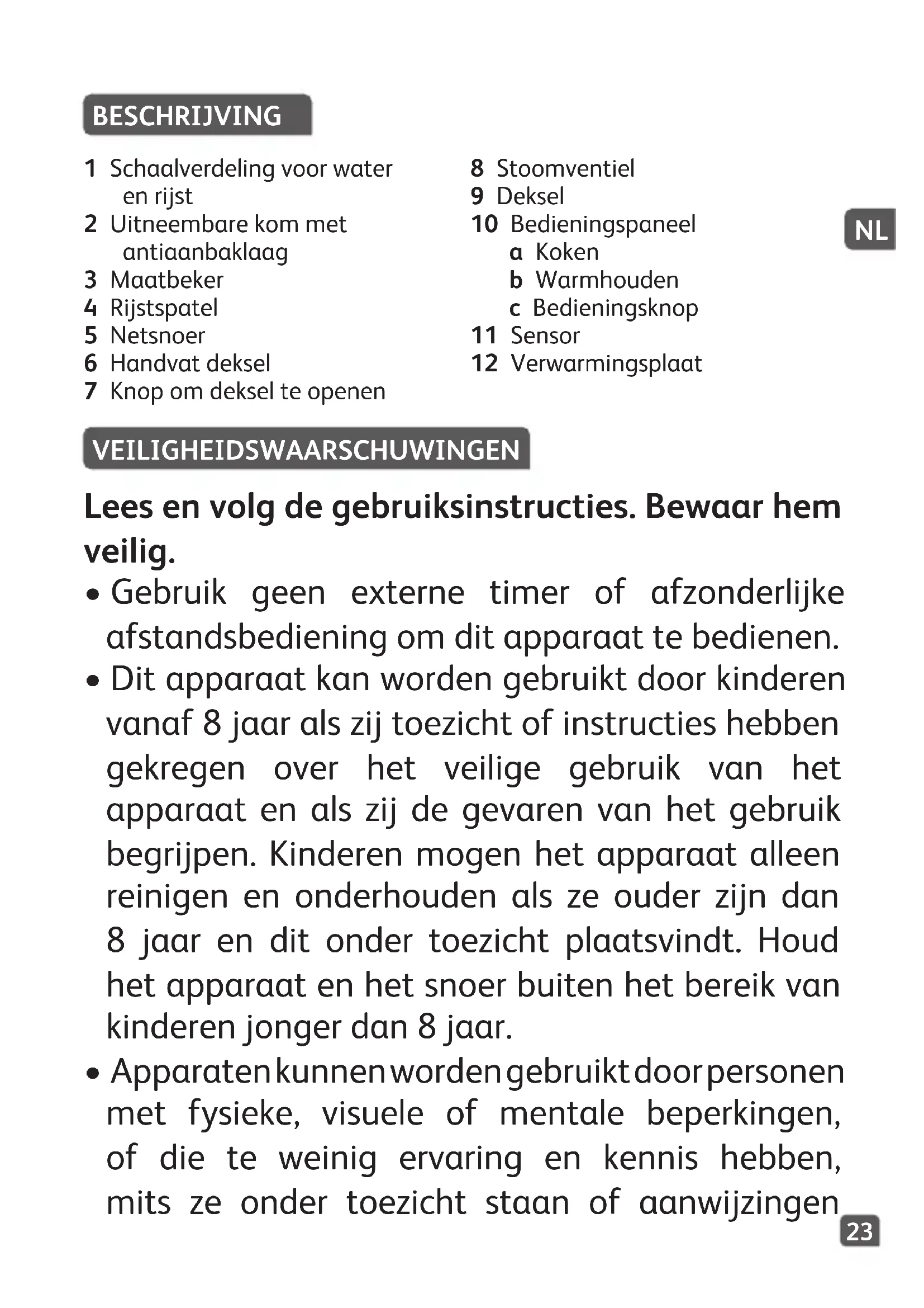 - Apparaten kunnen worden gebruikt door personen met fysieke, visuele of mentale beperkingen, of die te weinig ervaring en kennis hebben, mits ze onder toezicht staan of aanwijzingen BESCHRIJVING 1 Schaalverdeling voor water en rijst 2 Uitneembare kom met antiaanbaklaag 3 Maatbeker 4 Rijstspatel 5 Netsnoer 6 Handvat deksel 7 Knop om deksel te openen 8 Stoomventiel 9 Deksel 10 Bedieningspaneel a Koken b Warmhouden c Bedieningsknop 11 Sensor 12 Verwarmingsplaat2524
