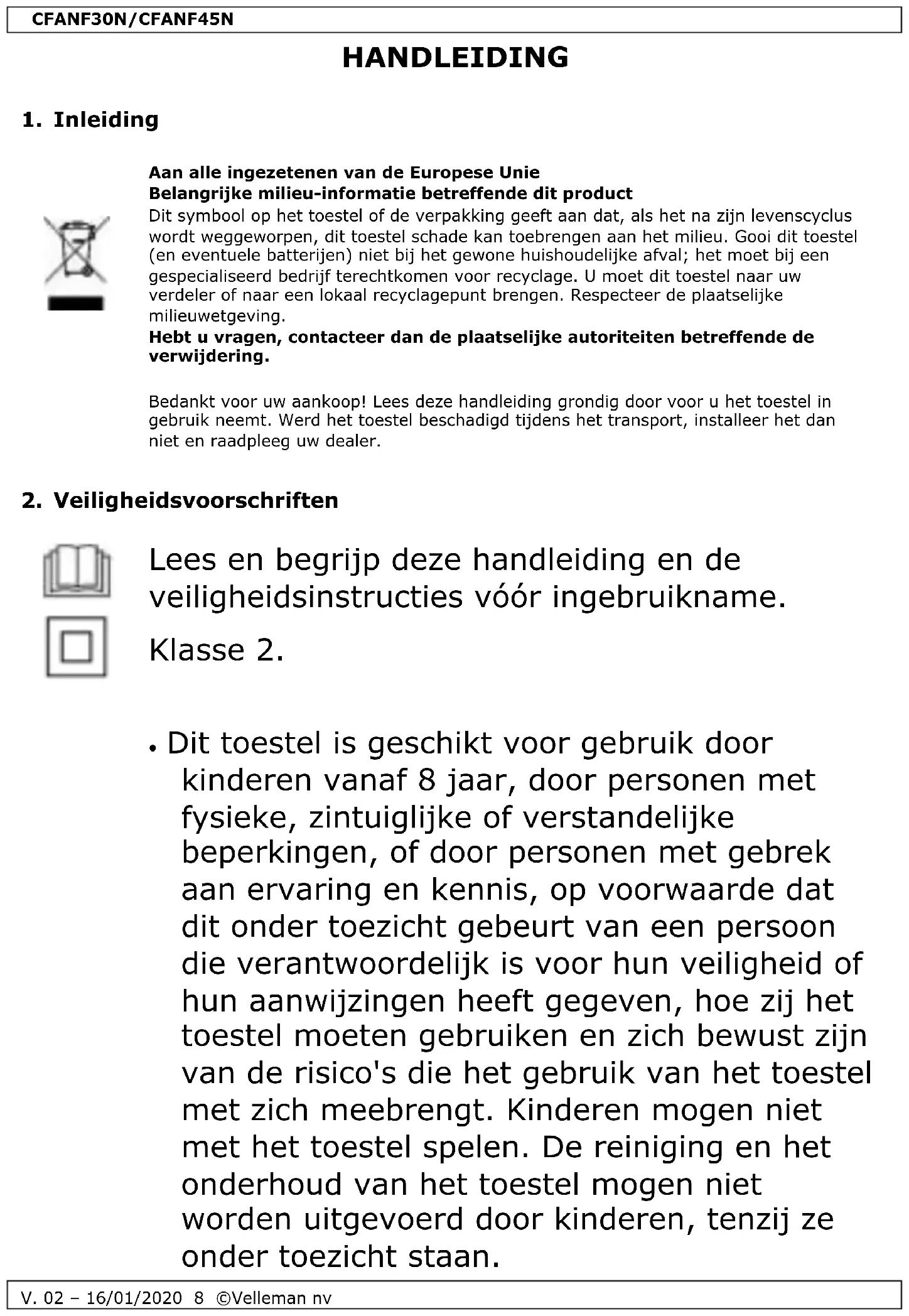- Dit toestel is geschikt voor gebruik door kinderen vanaf 8 jaar, door personen met fysieke, zintuiglijke of verstandelijke beperkingen, of door personen met gebrek aan ervaring en kennis, op voorwaarde dat dit onder toezicht gebeurt van een persoon die verantwoordelijk is voor hun veiligheid of hun aanwijzingen heeft gegeven, hoe zij het toestel moeten gebruiken en zich bewust zijn van de risico's die het gebruik van het toestel met zich meebrengt. Kinderen mogen niet met het toestel spelen. De reiniging en het onderhoud van het toestel mogen niet worden uitgevoerd door kinderen, tenzij ze onder toezicht staan.CFANF30N/CFANF45N