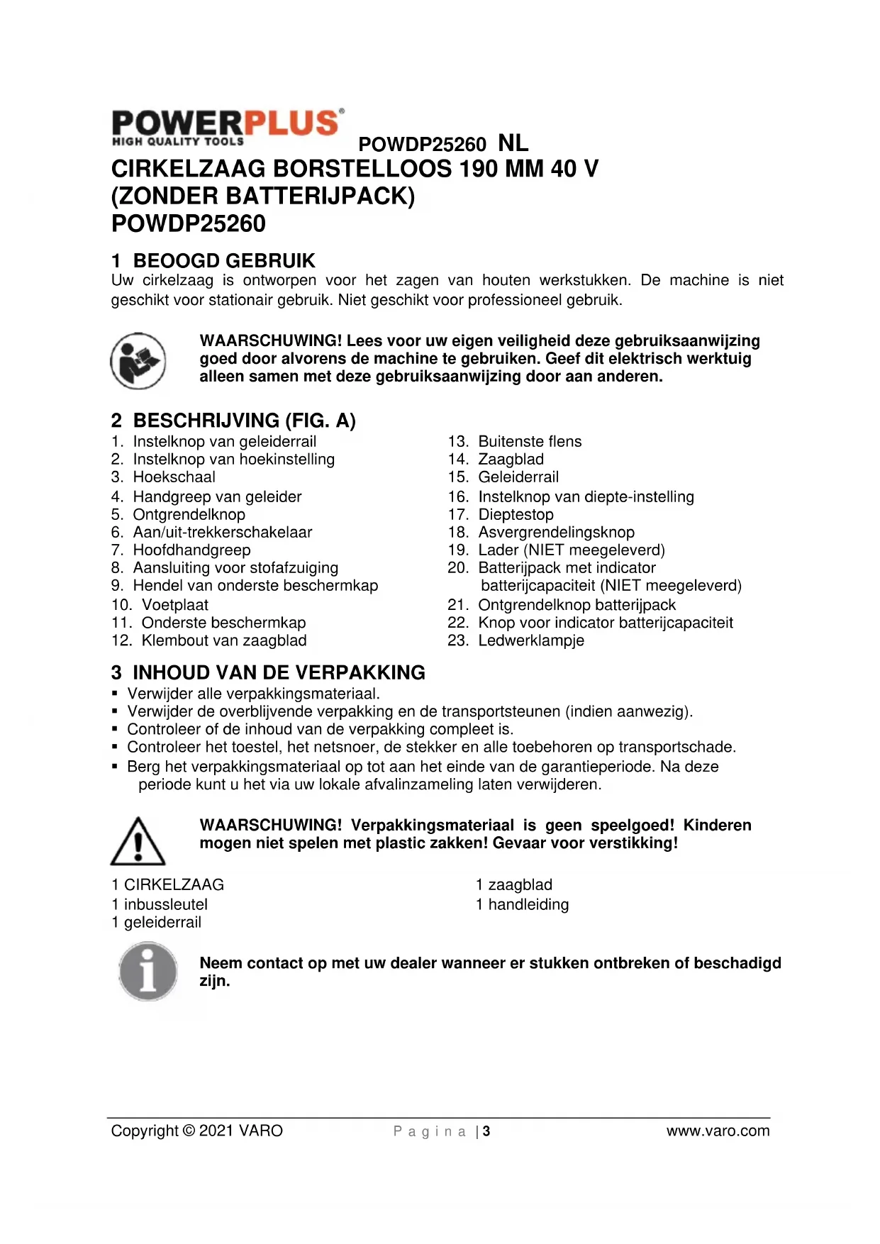- Berg het verpakkingsmateriaal op tot aan het einde van de garantieperiode. Na deze periode kunt u het via uw lokale afvalinzameling laten verwijderen. WAARSCHUWING! Verpakkingsmateriaal is geen speelgoed! Kinderen mogen niet spelen met plastic zakken! Gevaar voor verstikking! 1 CIRKELZAAG 1 inbussleutel 1 geleiderrail 1 zaagblad 1 handleiding Neem contact op met uw dealer wanneer er stukken ontbreken of beschadigd zijn.POWDP25260 NL Copyright © 2021 VARO P a g i n a | 4 www.varo.com