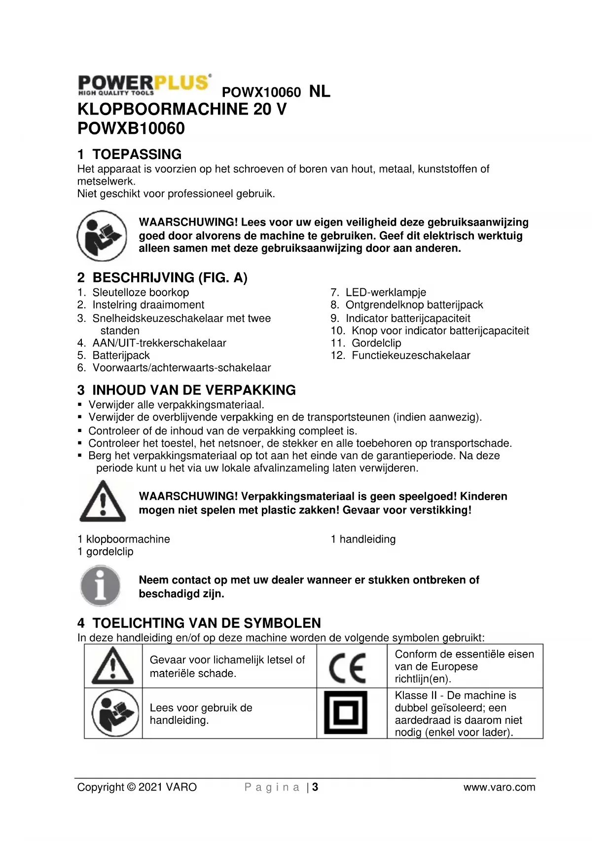 Klasse II - De machine is dubbel geïsoleerd; een aardedraad is daarom niet nodig (enkel voor lader).POWX10060 NL Copyright © 2021 VARO P a g i n a | 4 www.varo.com