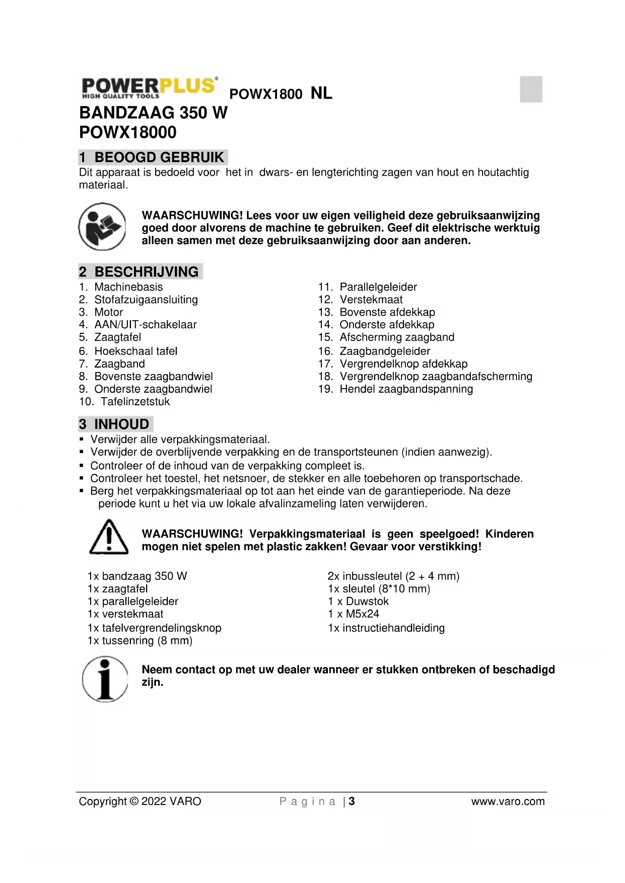 - Berg het verpakkingsmateriaal op tot aan het einde van de garantieperiode. Na deze periode kunt u het via uw lokale afvalinzameling laten verwijderen. WAARSCHUWING! Verpakkingsmateriaal is geen speelgoed! Kinderen mogen niet spelen met plastic zakken! Gevaar voor verstikking! 1x bandzaag 350 W 1x zaagtafel 1x parallelgeleider 1x verstekmaat 1x tafelvergrendelingsknop 1x tussenring (8 mm) 2x inbussleutel (2 + 4 mm) 1x sleutel (8*10 mm) 1 x Duwstok 1 x M5x24 1x instructiehandleiding Neem contact op met uw dealer wanneer er stukken ontbreken of beschadigd zijn.POWX1800 NL Copyright © 2022 VARO P a g i n a | 4 www.varo.com
