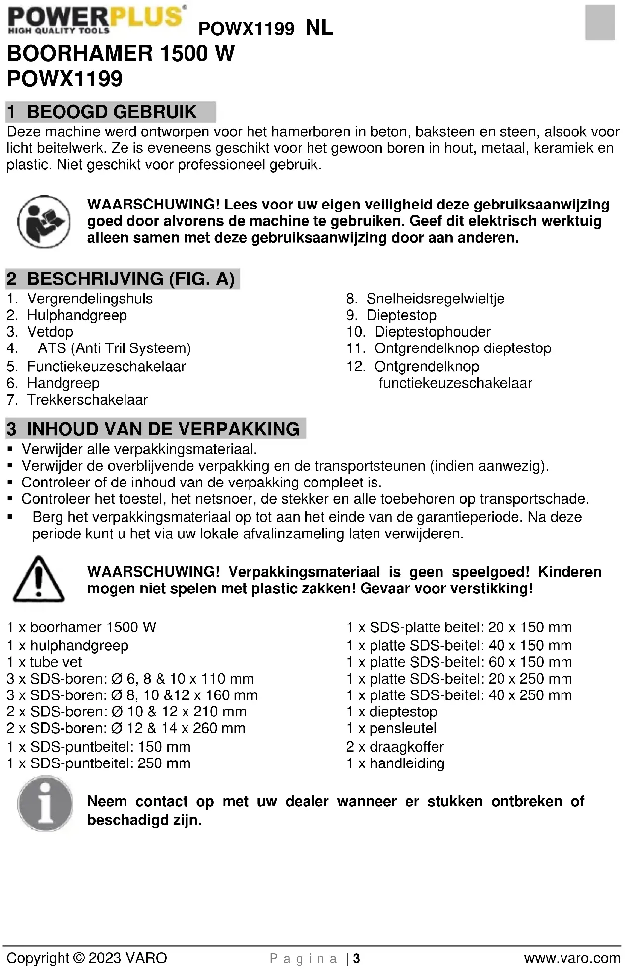 - Berg het verpakkingsmateriaal op tot aan het einde van de garantieperiode. Na deze periode kunt u het via uw lokale afvalinzameling laten verwijderen. WAARSCHUWING! Verpakkingsmateriaal is geen speelgoed! Kinderen mogen niet spelen met plastic zakken! Gevaar voor verstikking! 1 x boorhamer 1500 W 1 x hulphandgreep 1 x tube vet 3 x SDS-boren: Ø 6, 8 & 10 x 110 mm 3 x SDS-boren: Ø 8, 10 &12 x 160 mm 2 x SDS-boren: Ø 10 & 12 x 210 mm 2 x SDS-boren: Ø 12 & 14 x 260 mm 1 x SDS-puntbeitel: 150 mm 1 x SDS-puntbeitel: 250 mm 1 x SDS-platte beitel: 20 x 150 mm 1 x platte SDS-beitel: 40 x 150 mm 1 x platte SDS-beitel: 60 x 150 mm 1 x platte SDS-beitel: 20 x 250 mm 1 x platte SDS-beitel: 40 x 250 mm 1 x dieptestop 1 x pensleutel 2 x draagkoffer 1 x handleiding Neem contact op met uw dealer wanneer er stukken ontbreken of beschadigd zijn.POWX1199 NL Copyright © 2023 VARO P a g i n a | 4 www.varo.com