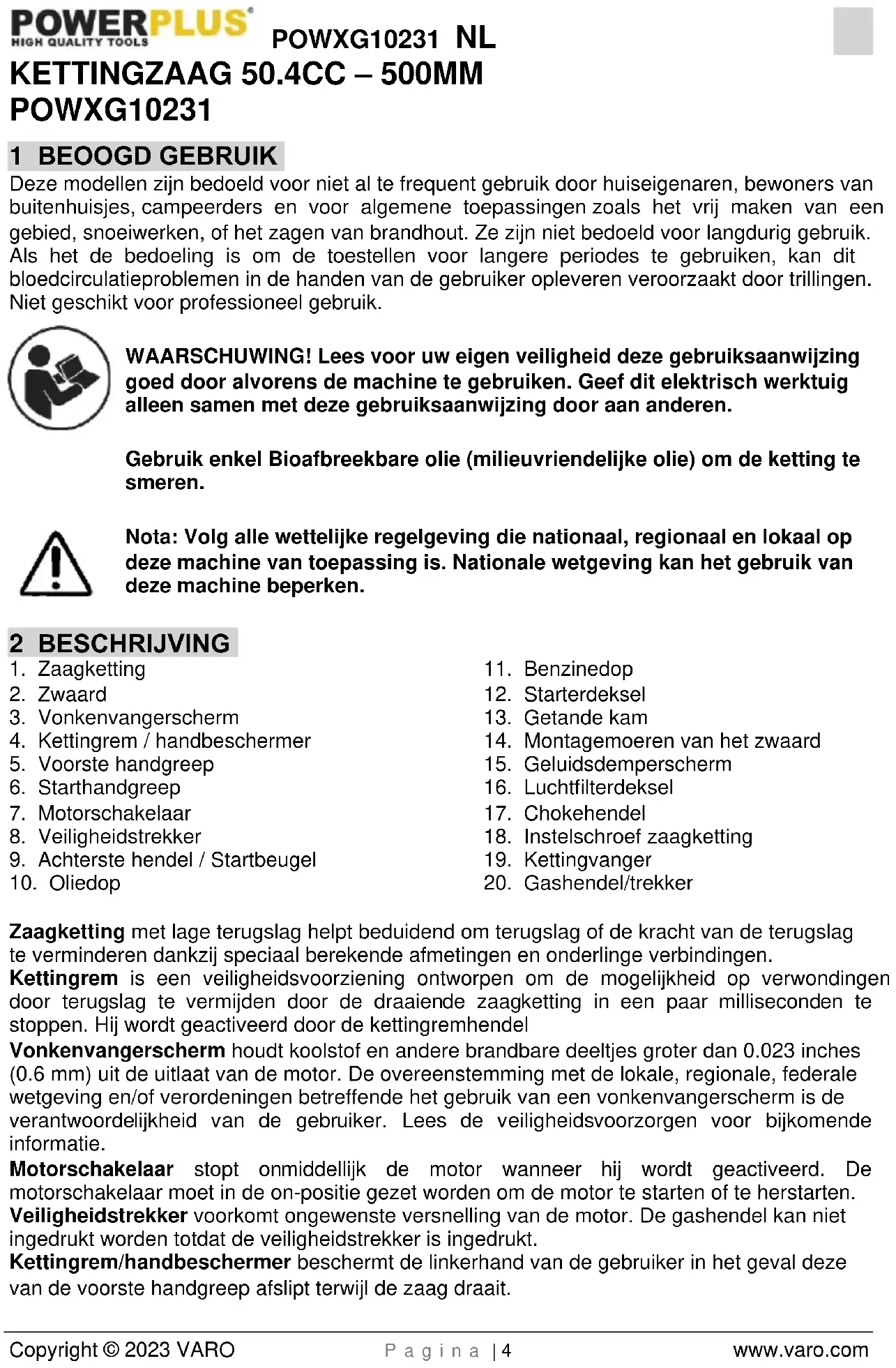 - Berg het verpakkingsmateriaal op tot aan het einde van de garantieperiode. Na deze periode kunt u het via uw lokale afvalinzameling laten verwijderen. WAARSCHUWING! Verpakkingsmateriaal is geen speelgoed! Kinderen mogen niet spelen met plastic zakken! Gevaar voor verstikking! 1x kettingzaag op benzine 50.4cc, 500mm 1x montagematerialen set 1x mesbescherming 1x ketting 1x lege fles 1x vijl 1x zwaard 2x zeskantsleutel 1x handleiding 1x schroevendraaier 1x bougiesleutel 1x getande kam Neem contact op met uw dealer wanneer er stukken ontbreken of beschadigd zijn.POWXG10231 NL Copyright © 2023 VARO P a g i n a | 6 www.varo.com