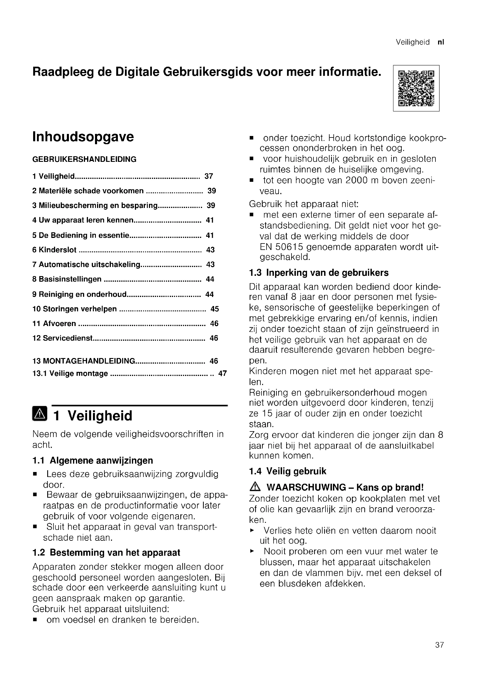1 Veiligheid Neem de volgende veiligheidsvoorschriften in acht. 1.1 Algemene aanwijzingen ¡ Lees deze gebruiksaanwijzing zorgvuldig door. ¡ Bewaar de gebruiksaanwijzingen, de appa- raatpas en de productinformatie voor later gebruik of voor volgende eigenaren. ¡ Sluit het apparaat in geval van transport- schade niet aan. 1.2 Bestemming van het apparaat Apparaten zonder stekker mogen alleen door geschoold personeel worden aangesloten. Bij schade door een verkeerde aansluiting kunt u geen aanspraak maken op garantie. Gebruik het apparaat uitsluitend: ¡ om voedsel en dranken te bereiden. ¡ onder toezicht. Houd kortstondige kookpro- cessen ononderbroken in het oog. ¡ voor huishoudelijk gebruik en in gesloten ruimtes binnen de huiselijke omgeving. ¡ tot een hoogte van 2000m boven zeeni- veau. Gebruik het apparaat niet: ¡ met een externe timer of een separate af- standsbediening. Dit geldt niet voor het ge- val dat de werking middels de door EN50615 genoemde apparaten wordt uit- geschakeld. 1.3 Inperking van de gebruikers Dit apparaat kan worden bediend door kinde- ren vanaf 8 jaar en door personen met fysie- ke, sensorische of geestelijke beperkingen of met gebrekkige ervaring en/of kennis, indien zij onder toezicht staan of zijn geïnstrueerd in het veilige gebruik van het apparaat en de daaruit resulterende gevaren hebben begre- pen. Kinderen mogen niet met het apparaat spe- len. Reiniging en gebruikersonderhoud mogen niet worden uitgevoerd door kinderen, tenzij ze 15jaar of ouder zijn en onder toezicht staan. Zorg ervoor dat kinderen die jonger zijn dan 8 jaar niet bij het apparaat of de aansluitkabel kunnen komen. 1.4 Veilig gebruik WAARSCHUWING‒Kans op brand! Zonder toezicht koken op kookplaten met vet of olie kan gevaarlijk zijn en brand veroorza- ken. ▶ Verlies hete oliën en vetten daarom nooit uit het oog. ▶ Nooit proberen om een vuur met water te blussen, maar het apparaat uitschakelen en dan de vlammen bijv. met een deksel of een blusdeken afdekken.nl Veiligheid