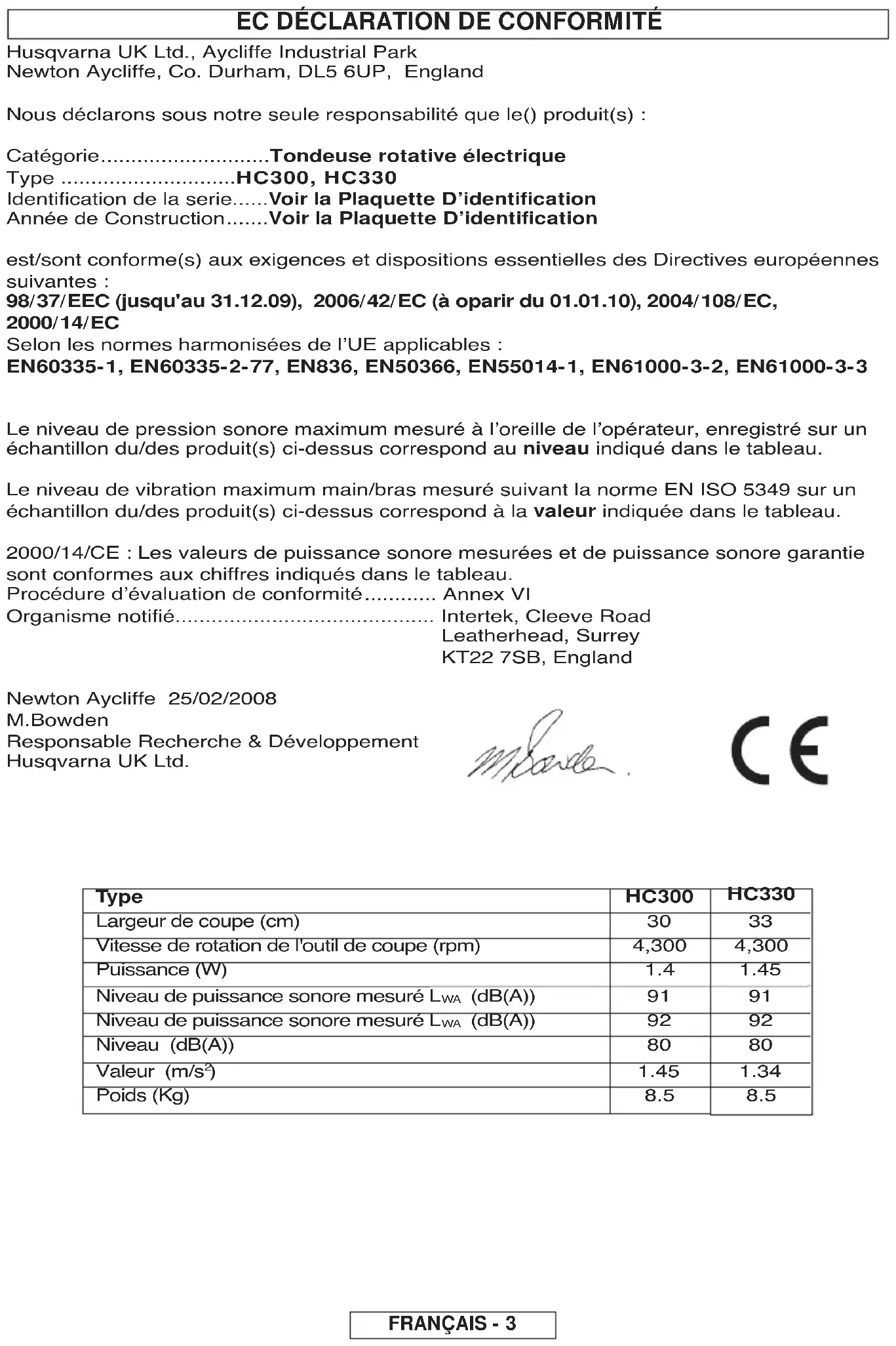 - U wordt ten zeerste aangeraden uw product ten minste elke twaalf maanden een service-beurt te geven, vaker indien het beroepshalve veelvuldig wordt gebruikt.EC CONFORMITEITSVERKLARING Husqvarna UK Ltd., Aycliffe Industrial Park Newton Aycliffe, Co. Durham, DL5 6UP, England Verklaren op eigen verantwoording dat het(de) product(en); Category............................Elektrische schijvenmaaier Type ............................HC300, HC330 Identificatie van serie........Zie Productlabel Bouwjaar ...........................Zie Productlabel Voldoet(voldoen) aan de essentiële eisen en voorzieningen van de volgende EG-richtlijnen: 98/37/EEC (tot 31.12.09), 2006/42/EC (vanaf 01.01.10), 2004/108/EC, 2000/14/EC gebaseerd op de volgende toegepaste binnen de EU geharmoniseerde standaarden: EN60335-1, EN60335-2-77, EN836, EN50366, EN55014-1, EN61000-3-2, EN61000-3-3 Het A-gewogen geluidsdrukniveau L