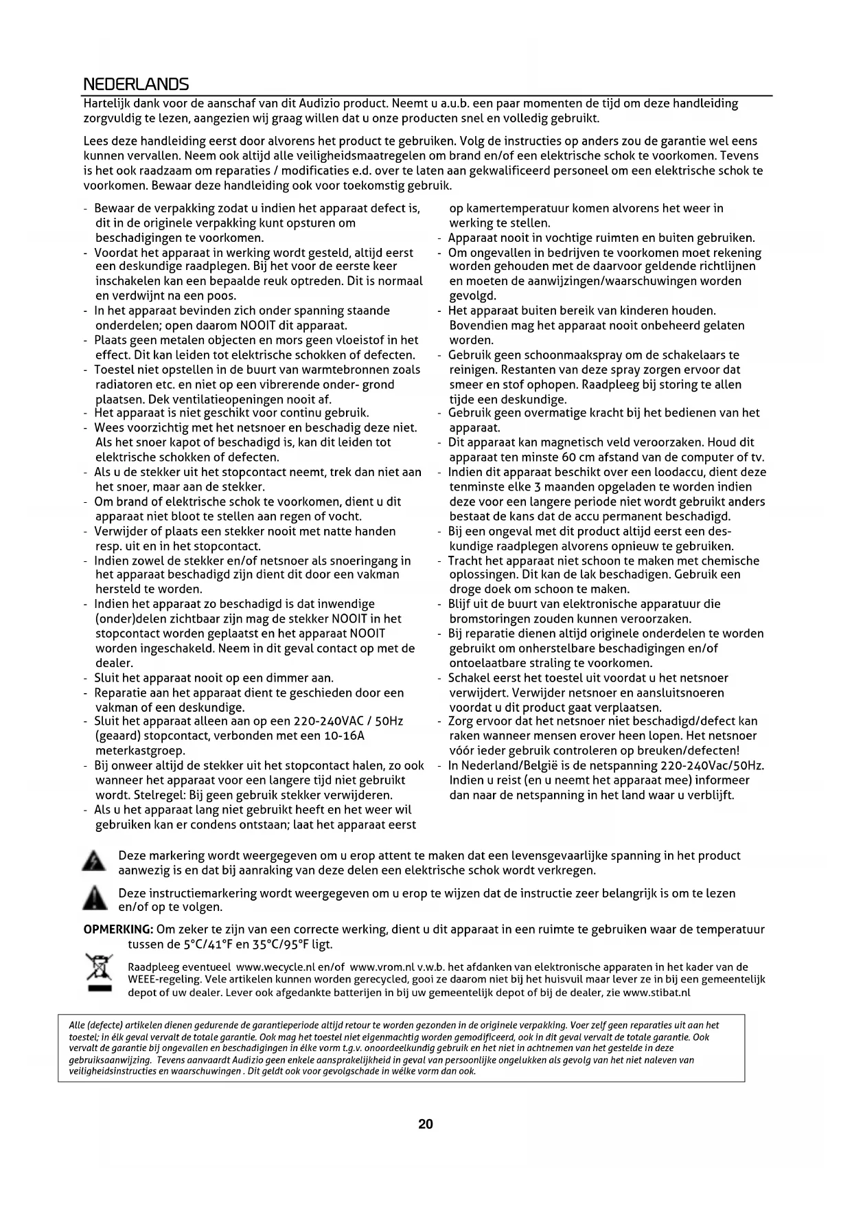 Alle (defecte) artikelen dienen gedurende de garantieperiode altijd retour te worden gezonden in de originele verpakking. Voer zelf geen reparaties uit aan het toestel; in élk geval vervalt de totale garantie. Ook mag het toestel niet eigenmachtig worden gemodificeerd, ook in dit geval vervalt de totale garantie. Ook vervalt de garantie bij ongevallen en beschadigingen in élke vorm t.g.v. onoordeelkundig gebruik en het niet in achtnemen van het gestelde in deze gebruiksaanwijzing. Tevens aanvaardt Audizio geen enkele aansprakelijkheid in geval van persoonlijke ongelukken als gevolg van het niet naleven van veiligheidsinstructies en waarschuwingen . Dit geldt ook voor gevolgschade in wélke vorm dan ook.21 UITPAKKEN LET OP! Onmiddellijk na ontvangst, zorgvuldig uitpakken van de doos, controleer de inhoud om ervoor te zorgen dat alle onderdelen aanwezig zijn en zijn in goede staat zijn ontvangen. Bij transportschade of ontbreken van onderdelen onmiddellijk de verkopende partij inlichten. Bewaar de verpakking en het verpakkingsmateriaal. Indien het product moet worden teruggestuurd, is het belangrijk dat het product in originele verpakking wordt geretourneerd. Als het apparaat is blootgesteld aan drastische temperatuurverschillen (bv. na het transport), schakel het apparaat niet onmiddellijk in. De ontstane condensatie kan het apparaat beschadigen. Zorg ervoor dat het apparaat op kamertemperatuur komt en steek vervolgens de voeding stekker in het stopcontact/wandcontactdoos. AANSLUITSPANNING Op het label aan de achterzijde van het product staat aangegeven op welke netspanning deze moet worden aangesloten. Controleer of de netspanning hiermee overeenkomt, bij alle andere netspanningen dan aangegeven kan het apparaat onherstelbaar worden beschadigd. Tevens moet het apparaat direct op de netspanning worden aangesloten en mag géén dimmer of regelbare voeding worden gebruikt. Sluit het apparaat altijd aan op een beschermd circuit (aardlekschakelaar of zekering). Zorg ervoor dat het apparaat voldoende elektrisch is geaard om het risico op elektrocutie of brand te vermijden. BEDIENING