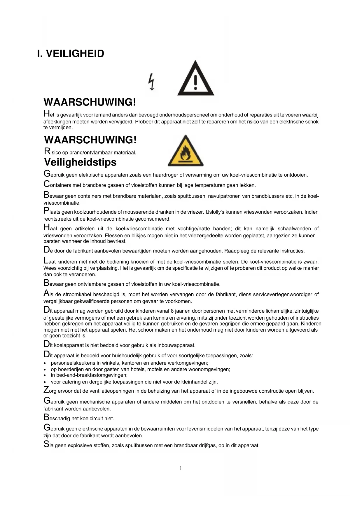 WAARSCHUWING! Het is gevaarlijk voor iemand anders dan bevoegd onderhoudspersoneel om onderhoud of reparaties uit te voeren waarbij afdekkingen moeten worden verwijderd. Probeer dit apparaat niet zelf te repareren om het risico van een elektrische schok te vermijden. WAARSCHUWING! Risico op brand/ontvlambaar materiaal. Veiligheidstips Gebruik geen elektrische apparaten zoals een haardroger of verwarming om uw koel-vriescombinatie te ontdooien. Containers met brandbare gassen of vloeistoffen kunnen bij lage temperaturen gaan lekken. Bewaar geen containers met brandbare materialen, zoals spuitbussen, navulpatronen van brandblussers etc. in de koel- vriescombinatie. Plaats geen koolzuurhoudende of mousserende dranken in de vriezer. IJslolly's kunnen vrieswonden veroorzaken. Indien rechtstreeks uit de koel-vriescombinatie geconsumeerd. Haal geen artikelen uit de koel-vriescombinatie met vochtige/natte handen; dit kan namelijk schaafwonden of vrieswonden veroorzaken. Flessen en blikjes mogen niet in het vriezergedeelte worden geplaatst, aangezien ze kunnen barsten wanneer de inhoud bevriest. De door de fabrikant aanbevolen bewaartijden moeten worden aangehouden. Raadpleeg de relevante instructies. Laat kinderen niet met de bediening knoeien of met de koel-vriescombinatie spelen. De koel-vriescombinatie is zwaar. Wees voorzichtig bij verplaatsing. Het is gevaarlijk om de specificatie te wijzigen of te proberen dit product op welke manier dan ook te veranderen. Bewaar geen ontvlambare gassen of vloeistoffen in uw koel-vriescombinatie. Als de stroomkabel beschadigd is, moet het worden vervangen door de fabrikant, diens servicevertegenwoordiger of vergelijkbaar gekwalificeerde personen om gevaar te voorkomen. Dit apparaat mag worden gebruikt door kinderen vanaf 8 jaar en door personen met verminderde lichamelijke, zintuiglijke of geestelijke vermogens of met een gebrek aan kennis en ervaring, mits zij onder toezicht worden gehouden of instructies hebben gekregen om het apparaat veilig te kunnen gebruiken en de gevaren begrijpen die ermee gepaard gaan. Kinderen mogen niet met het apparaat spelen. Het schoonmaken en het onderhoud mag niet door kinderen worden uitgevoerd als er geen toezicht is. Dit koelapparaat is niet bedoeld voor gebruik als inbouwapparaat. Dit apparaat is bedoeld voor huishoudelijk gebruik of voor soortgelijke toepassingen, zoals: