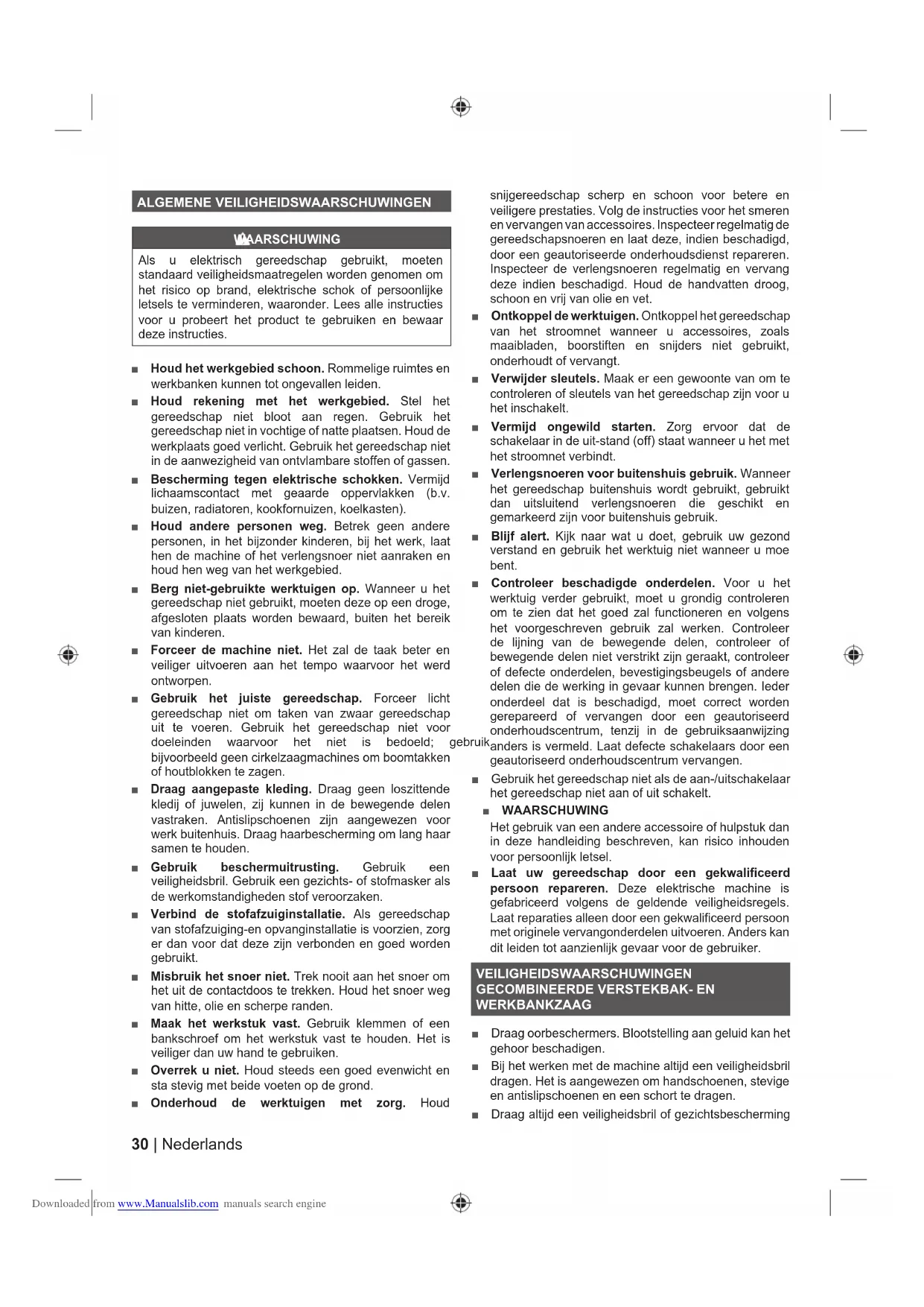 strutture per smaltire tali prodotti. Note Avvertenze Downloaded from www.Manualslib.com manuals search engine30 | Nederlands ALGEMENE VEILIGHEIDSWAARSCHUWINGEN WAARSCHUWING Als u elektrisch gereedschap gebruikt, moeten standaard veiligheidsmaatregelen worden genomen om het risico op brand, elektrische schok of persoonlijke letsels te verminderen, waaronder. Lees alle instructies voor u probeert het product te gebruiken en bewaar deze instructies. Ŷ Houd het werkgebied schoon. Rommelige ruimtes en werkbanken kunnen tot ongevallen leiden. Ŷ Houd rekening met het werkgebied. Stel het gereedschap niet bloot aan regen. Gebruik het gereedschap niet in vochtige of natte plaatsen. Houd de werkplaats goed verlicht. Gebruik het gereedschap niet in de aanwezigheid van ontvlambare stoffen of gassen. Ŷ Bescherming tegen elektrische schokken. Vermijd lichaamscontact met geaarde oppervlakken (b.v. buizen, radiatoren, kookfornuizen, koelkasten). Ŷ Houd andere personen weg. Betrek geen andere personen, in het bijzonder kinderen, bij het werk, laat hen de machine of het verlengsnoer niet aanraken en houd hen weg van het werkgebied. Ŷ Berg niet-gebruikte werktuigen op. Wanneer u het gereedschap niet gebruikt, moeten deze op een droge, afgesloten plaats worden bewaard, buiten het bereik van kinderen. Ŷ Forceer de machine niet. Het zal de taak beter en veiliger uitvoeren aan het tempo waarvoor het werd ontworpen. Ŷ Gebruik het juiste gereedschap. Forceer licht gereedschap niet om taken van zwaar gereedschap uit te voeren. Gebruik het gereedschap niet voor GRHOHLQGHQ ZDDUYRRU KHW QLHW LV EHGRHOG JHEUXLN bijvoorbeeld geen cirkelzaagmachines om boomtakken of houtblokken te zagen. Ŷ Draag aangepaste kleding. Draag geen loszittende kledij of juwelen, zij kunnen in de bewegende delen vastraken. Antislipschoenen zijn aangewezen voor werk buitenhuis. Draag haarbescherming om lang haar samen te houden. Ŷ Gebruik beschermuitrusting. Gebruik een veiligheidsbril. Gebruik een gezichts- of stofmasker als de werkomstandigheden stof veroorzaken. Ŷ Verbind de stofafzuiginstallatie. Als gereedschap van stofafzuiging-en opvanginstallatie is voorzien, zorg er dan voor dat deze zijn verbonden en goed worden gebruikt. Ŷ Misbruik het snoer niet. Trek nooit aan het snoer om het uit de contactdoos te trekken. Houd het snoer weg van hitte, olie en scherpe randen. Ŷ Maak het werkstuk vast. Gebruik klemmen of een bankschroef om het werkstuk vast te houden. Het is veiliger dan uw hand te gebruiken. Ŷ Overrek u niet. Houd steeds een goed evenwicht en sta stevig met beide voeten op de grond. Ŷ Onderhoud de werktuigen met zorg. Houd snijgereedschap scherp en schoon voor betere en veiligere prestaties. Volg de instructies voor het smeren en vervangen van accessoires. Inspecteer regelmatig de gereedschapsnoeren en laat deze, indien beschadigd, door een geautoriseerde onderhoudsdienst repareren. Inspecteer de verlengsnoeren regelmatig en vervang deze indien beschadigd. Houd de handvatten droog, schoon en vrij van olie en vet. Ŷ Ontkoppel de werktuigen. Ontkoppel het gereedschap van het stroomnet wanneer u accessoires, zoals maaibladen, boorstiften en snijders niet gebruikt, onderhoudt of vervangt. Ŷ Verwijder sleutels. Maak er een gewoonte van om te controleren of sleutels van het gereedschap zijn voor u het inschakelt. Ŷ Vermijd ongewild starten. Zorg ervoor dat de schakelaar in de uit-stand (off) staat wanneer u het met het stroomnet verbindt. Ŷ Verlengsnoeren voor buitenshuis gebruik. Wanneer het gereedschap buitenshuis wordt gebruikt, gebruikt dan uitsluitend verlengsnoeren die geschikt en gemarkeerd zijn voor buitenshuis gebruik. Ŷ Blijf alert. Kijk naar wat u doet, gebruik uw gezond verstand en gebruik het werktuig niet wanneer u moe bent. Ŷ Controleer beschadigde onderdelen. Voor u het werktuig verder gebruikt, moet u grondig controleren om te zien dat het goed zal functioneren en volgens het voorgeschreven gebruik zal werken. Controleer de lijning van de bewegende delen, controleer of bewegende delen niet verstrikt zijn geraakt, controleer of defecte onderdelen, bevestigingsbeugels of andere delen die de werking in gevaar kunnen brengen. Ieder onderdeel dat is beschadigd, moet correct worden gerepareerd of vervangen door een geautoriseerd onderhoudscentrum, tenzij in de gebruiksaanwijzing anders is vermeld. Laat defecte schakelaars door een geautoriseerd onderhoudscentrum vervangen. Ŷ Gebruik het gereedschap niet als de aan-/uitschakelaar het gereedschap niet aan of uit schakelt. Ŷ WAARSCHUWING Het gebruik van een andere accessoire of hulpstuk dan in deze handleiding beschreven, kan risico inhouden voor persoonlijk letsel. Ŷ Laat uw gereedschap door een gekwalificeerd persoon repareren. Deze elektrische machine is gefabriceerd volgens de geldende veiligheidsregels. Laat reparaties alleen door een gekwalificeerd persoon met originele vervangonderdelen uitvoeren. Anders kan dit leiden tot aanzienlijk gevaar voor de gebruiker. VEILIGHEIDSWAARSCHUWINGEN