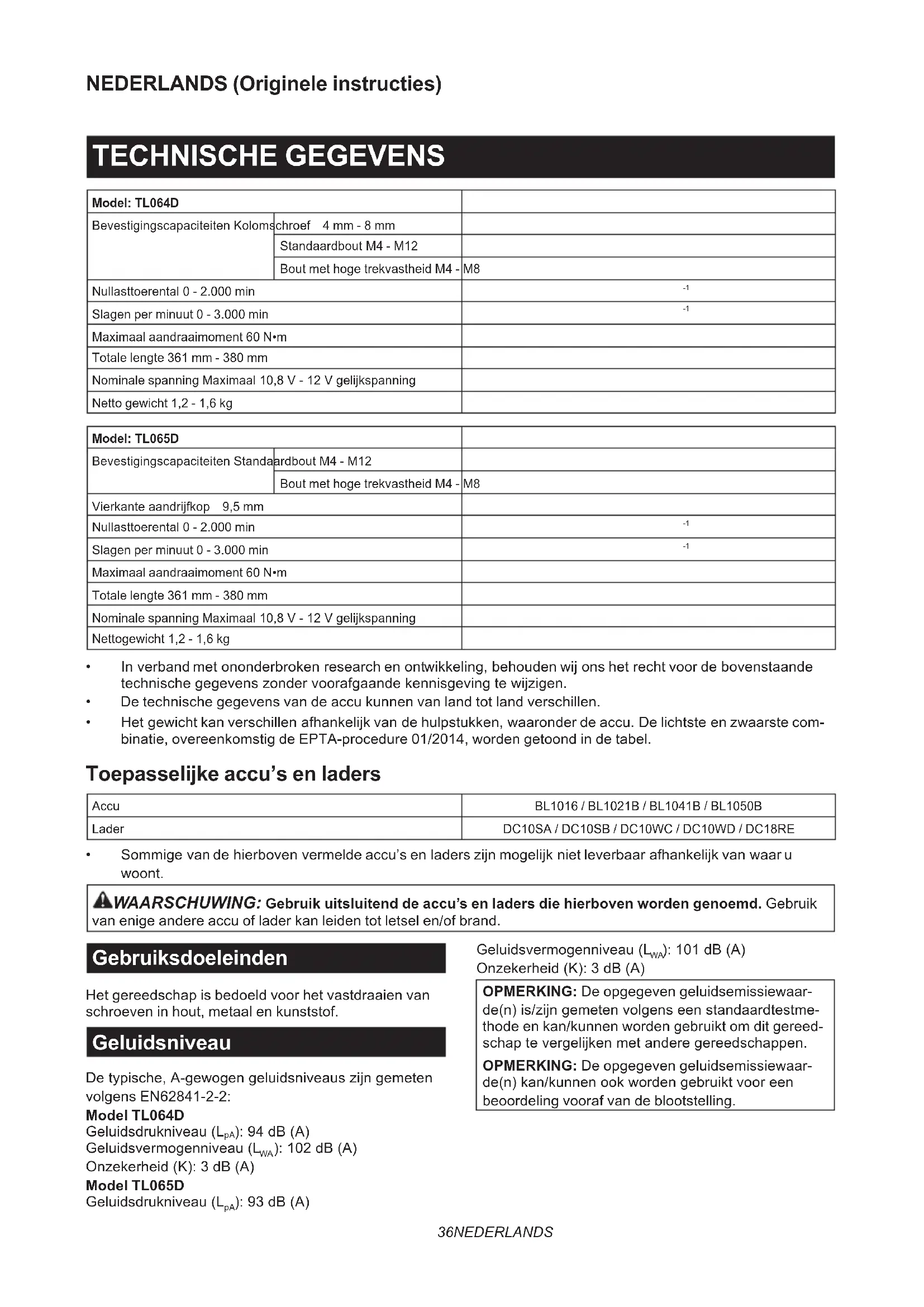 - Sommigevandehierbovenvermeldeaccu’senladerszijnmogelijknietleverbaarafhankelijkvanwaaru woont. WAARSCHUWING: Gebruik uitsluitend de accu’s en laders die hierboven worden genoemd. Gebruik van enige andere accu of lader kan leiden tot letsel en/of brand. Gebruiksdoeleinden Het gereedschap is bedoeld voor het vastdraaien van schroeven in hout, metaal en kunststof. Geluidsniveau Detypische,A-gewogengeluidsniveauszijngemeten volgens EN62841-2-2: Model TL064D Geluidsdrukniveau(L