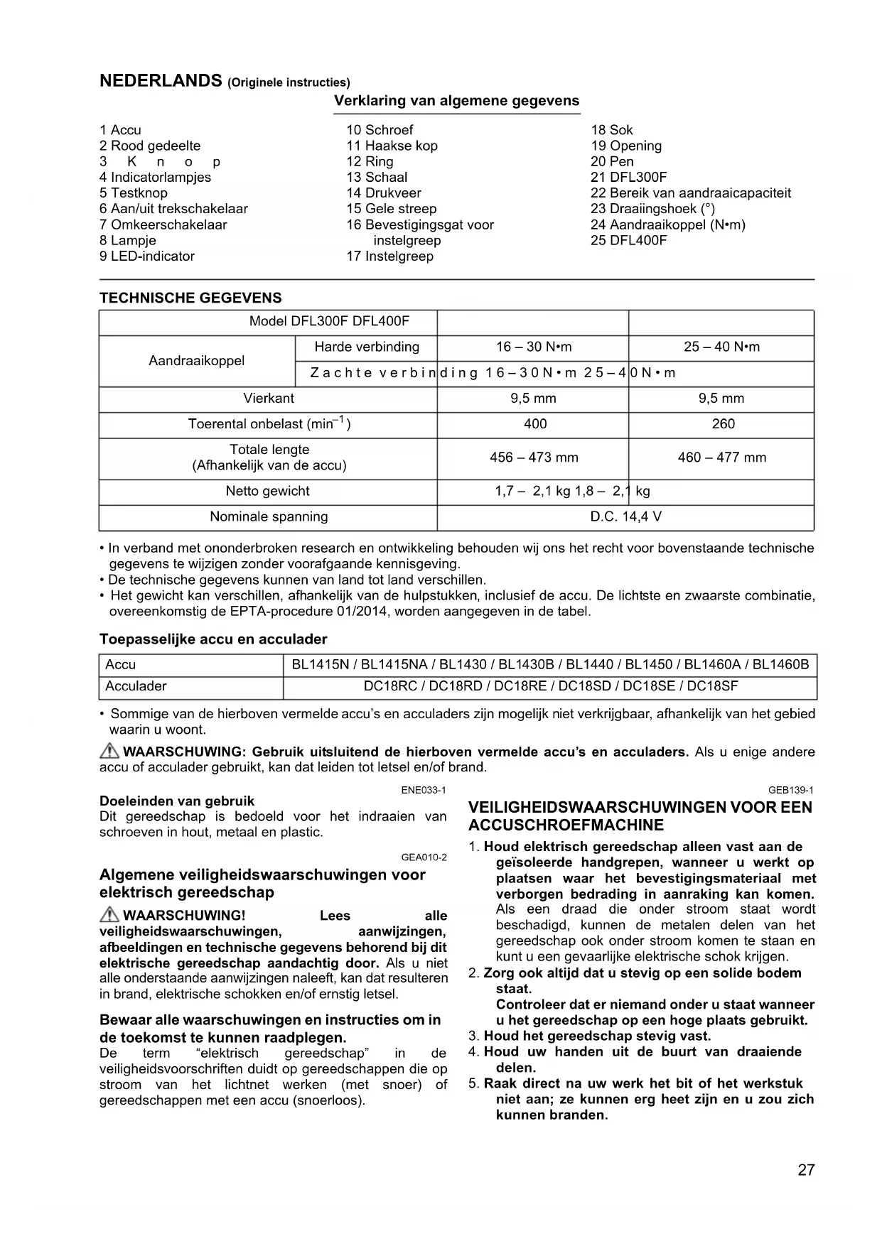 - Sommige van de hierboven vermelde accu’s en acculaders zijn mogelijk niet verkrijgbaar, afhankelijk van het gebied waarin u woont. WAARSCHUWING: Gebruik uitsluitend de hierboven vermelde accu’s en acculaders. Als u enige andere accu of acculader gebruikt, kan dat leiden tot letsel en/of brand. ENE033-1 Doeleinden van gebruik Dit gereedschap is bedoeld voor het indraaien van schroeven in hout, metaal en plastic. GEA010-2 Algemene veiligheidswaarschuwingen voor elektrisch gereedschap WAARSCHUWING! Lees alle veiligheidswaarschuwingen, aanwijzingen, afbeeldingen en technische gegevens behorend bij dit elektrische gereedschap aandachtig door. Als u niet alle onderstaande aanwijzingen naleeft, kan dat resulteren in brand, elektrische schokken en/of ernstig letsel. Bewaar alle waarschuwingen en instructies om in de toekomst te kunnen raadplegen. De term “elektrisch gereedschap” in de veiligheidsvoorschriften duidt op gereedschappen die op stroom van het lichtnet werken (met snoer) of gereedschappen met een accu (snoerloos). GEB139-1