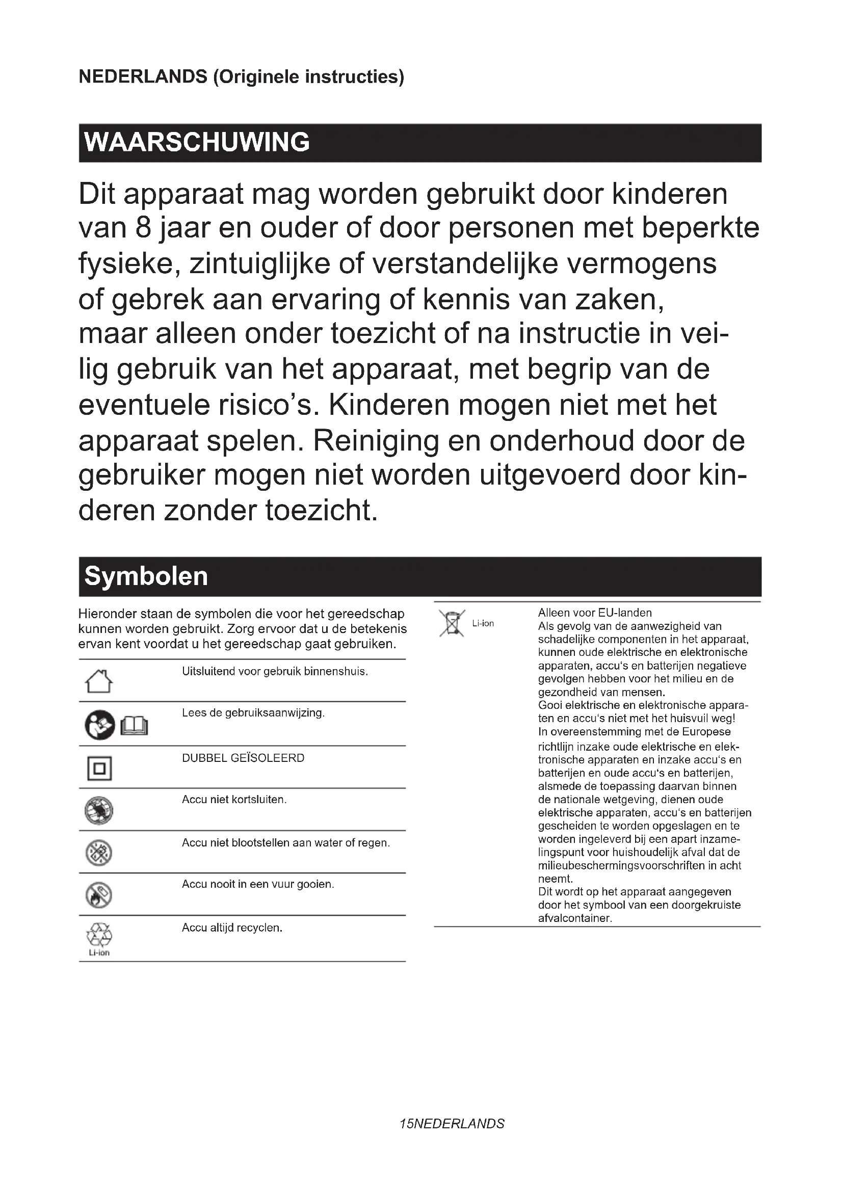 Accu niet kortsluiten. Accu niet blootstellen aan water of regen. Accu nooit in een vuur gooien. Accu altijd recyclen. Li-ion Alleen voor EU-landen Als gevolg van de aanwezigheid van schadelijke componenten in het apparaat, kunnen oude elektrische en elektronische apparaten, accu‘s en batterijen negatieve gevolgen hebben voor het milieu en de gezondheid van mensen. Gooi elektrische en elektronische appara- ten en accu‘s niet met het huisvuil weg! In overeenstemming met de Europese richtlijn inzake oude elektrische en elek- tronische apparaten en inzake accu‘s en batterijen en oude accu‘s en batterijen, alsmede de toepassing daarvan binnen de nationale wetgeving, dienen oude elektrische apparaten, accu‘s en batterijen gescheiden te worden opgeslagen en te worden ingeleverd bij een apart inzame- lingspunt voor huishoudelijk afval dat de milieubeschermingsvoorschriften in acht neemt. Dit wordt op het apparaat aangegeven door het symbool van een doorgekruiste afvalcontainer.16 NEDERLANDS ► Fig.1 Klaar voor opladen. Opladen vertraagd (accu is te heet of te koud). Bezig met opladen (0 - 80 %). Bezig met opladen (80 - 100 %). Opladen voltooid. Accu defect. LET OP