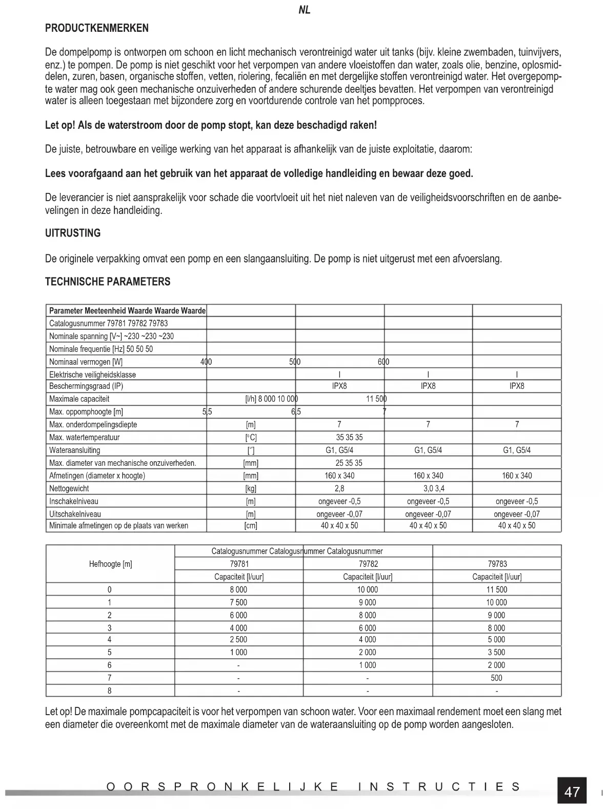 OORSPRONKELIJKE INSTRUCTIES PRODUCTKENMERKEN De dompelpomp is ontworpen om schoon en licht mechanisch verontreinigd water uit tanks (bijv. kleine zwembaden, tuinvijvers, enz.) te pompen. De pomp is niet geschikt voor het verpompen van andere vloeistoff en dan water, zoals olie, benzine, oplosmid- delen, zuren, basen, organische stoff en, vetten, riolering, fecaliën en met dergelijke stoff en verontreinigd water. Het overgepomp- te water mag ook geen mechanische onzuiverheden of andere schurende deeltjes bevatten. Het verpompen van verontreinigd water is alleen toegestaan met bijzondere zorg en voortdurende controle van het pompproces. Let op! Als de waterstroom door de pomp stopt, kan deze beschadigd raken! De juiste, betrouwbare en veilige werking van het apparaat is afhankelijk van de juiste exploitatie, daarom: Lees voorafgaand aan het gebruik van het apparaat de volledige handleiding en bewaar deze goed. De leverancier is niet aansprakelijk voor schade die voortvloeit uit het niet naleven van de veiligheidsvoorschriften en de aanbe- velingen in deze handleiding. UITRUSTING De originele verpakking omvat een pomp en een slangaansluiting. De pomp is niet uitgerust met een afvoerslang. TECHNISCHE PARAMETERS Parameter Meeteenheid Waarde Waarde Waarde Catalogusnummer 79781 79782 79783 Nominale spanning [V~] ~230 ~230 ~230 Nominale frequentie [Hz] 50 50 50 Nominaal vermogen [W] 400 500 600 Elektrische veiligheidsklasse I I I Beschermingsgraad (IP) IPX8 IPX8 IPX8 Maximale capaciteit [l/h] 8 000 10 000 11 500 Max. oppomphoogte [m] 5,5 6,5 7 Max. onderdompelingsdiepte [m] 7 7 7 Max. watertemperatuur [
