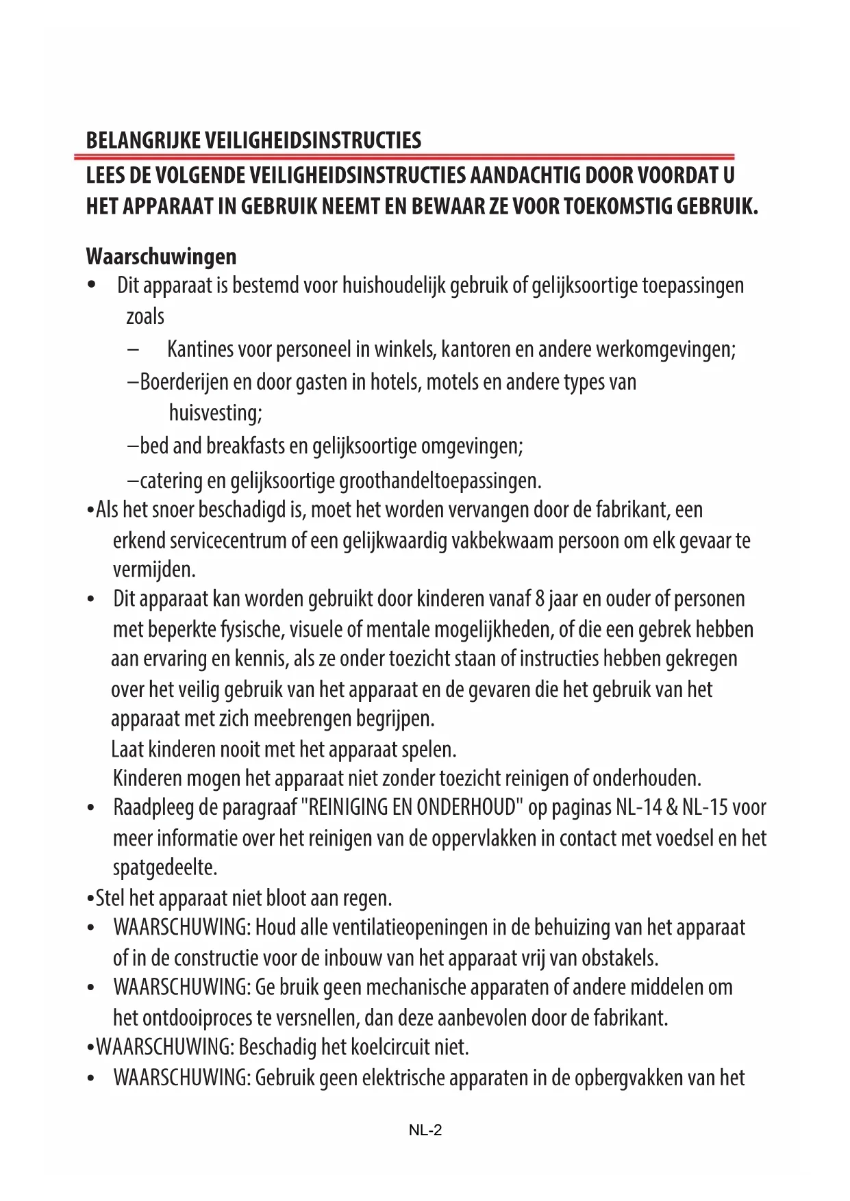 VERWIJDERING ..........................................................................................................................................20 NLBELANGRIJKE VEILIGHEIDSINSTRUCTIES LEES DE VOLGENDE VEILIGHEIDSINSTRUCTIES AANDACHTIG DOOR VOORDAT U HET APPARAAT IN GEBRUIK NEEMT EN BEWAAR ZE VOOR TOEKOMSTIG GEBRUIK. Waarschuwingen y Dit apparaat is bestemd voor huishoudelijk gebruik of gelijksoortige toepassingen zoals ࢼ Kantines voor personeel in winkels, kantoren en andere werkomgevingen; ࢼ Boerderijen en door gasten in hotels, motels en andere types van huisvesting; ࢼ bed and breakfasts en gelijksoortige omgevingen; ࢼ catering en gelijksoortige groothandeltoepassingen. y Als het snoer beschadigd is, moet het worden vervangen door de fabrikant, een erkend servicecentrum of een gelijkwaardig vakbekwaam persoon om elk gevaar te vermijden. y Dit apparaat kan worden gebruikt door kinderen vanaf 8 jaar en ouder of personen met beperkte fysische, visuele of mentale mogelijkheden, of die een gebrek hebben aan ervaring en kennis, als ze onder toezicht staan of instructies hebben gekregen over het veilig gebruik van het apparaat en de gevaren die het gebruik van het apparaat met zich meebrengen begrijpen. Laat kinderen nooit met het apparaat spelen. Kinderen mogen het apparaat niet zonder toezicht reinigen of onderhouden. y Raadpleeg de paragraaf "REINIGING EN ONDERHOUD" op paginas NL& NL voor meer informatie over het reinigen van de oppervlakken in contact met voedsel en het spatgedeelte. y Stel het apparaat niet bloot aan regen. y WAARSCHUWING: Houd alle ventilatieopeningen in de behuizing van het apparaat of in de constructie voor de inbouw van het apparaat vrij van obstakels. y WAARSCHUWING: Ge bruik geen mechanische apparaten of andere middelen om het ontdooiproces te versnellen, dan deze aanbevolen door de fabrikant. y WAARSCHUWING: Beschadig het koelcircuit niet. y WAARSCHUWING: Gebruik geen elektrische apparaten in de opbergvakken van het NL-2apparaat tenzij ze van het type zijn dat wordt aanbevolen door de fabrikant. y Berg geen explosieve stoffen, zoals spuitbussen met een brandbaar drijfgas, in dit apparaat op. y OPGELET: Het koelsysteem staat onder hoge druk. Raak het niet aan. Neem voor de afdanking contact op met een vakbekwaam servicecentrum. y INSTALLATIE:INSTALLEERDITAPPARAATNIETINEEN ZEER VOCHTIGEOF KOUDERUIMTE, ZOALSEEN BIJGEBOUW,GARAGE OFWIJNKELDER. y Het apparaat afdanken: Om mogelijke schade aan het milieu of aan de menselijke gezondheid door het ongecontroleerd weggooien van afval te voorkomen, recycle het apparaat op een verantwoordelijke wijze, om het duurzame hergebruik van grondstoffen, koelmiddel en brandbare isolatie- blaasgassen te bevorderen. Lever het apparaat in bij een inzamelpunt in uw gemeente. Neem contact op met het inzamelpunt in uw buurt voor meer informatie over de juiste verwijderingsprocedure. y Voor installatie, onderhoud: Plaats het apparaat op een horizontaal oppervlak en zorg voor voldoende ventilatie. Vervang of repareer de onderdelen niet zelf. Raadpleeg indien nodig het servicecentrum. y Hantering: Ga altijd met de nodige voorzichtigheid om met het apparaat om schade te voorkomen. y Waarschuwing; Brandgevaar / ontvlambare materialen y WAARSCHUWING: Tijdens het plaatsen van het apparaat, zorg dat het snoer niet verstrikt raakt of beschadigd wordt. y WAARSCHUWING: Plaats niet meerdere verlengsnoeren of stekkerdozen achter het apparaat. y Kinderen tussen 3 en 8 jaar oud mogen koelapparaten vullen en legen. y Om voedselverontreiniging te voorkomen, leef de volgende aanwijzingen na: ࢼ De deur te lang open laten kan een aanzienlijke toename van de temperatuur binnenin de vakken van het apparaat veroorzaken. NL-3ࢼ Maak de oppervlakken die met voedsel in aanraking komen en de toegankelijke afvoersystemen regelmatig schoon. ࢼ Bewaar rauw vlees en vis in gepaste houders in de koelkast zodat ze niet met ander voedsel in aanraking komen of erop druppelen. ࢼ Vriesvakken met twee sterren zijn geschikt voor het bewaren van reeds bevroren voedsel, het bewaren of maken van roomijs en het maken van ijsblokjes. ࢼ Vriesvakken met één, twee en drie sterren zijn niet geschikt voor het invriezen van vers voedsel. ࢼ Als het koelapparaat langere tijd leeg zal blijven, schakel het uit, ontdooi, reinig en veeg het apparaat droog en laat de deur open om vorming van schimmel in het apparaat te voorkomen. Veiligheidsmaatrege len y De stekker moet eenvoudig bereikbaar zijn wanneer de diepvries zich op zijn plaats bevindt. y Schakel de diepvries altijd uit en haal de stekker vervolgens uit het stopcontact wanneer u de diepvries niet gebruikt en voor reiniging. Verwijder alle levensmiddelen en de mand voordat u het apparaat reinigt. y Haal de stekker nooit uit het stopcontact door aan het snoer te trekken. Pak de stekker stevig vast en trek om deze uit het stopcontact te verwijderen. y Plaats de diepvries in een droge ruimte en niet in een ruimte met een hoge vochtigheidsgraad. y Houd de diepvries uit de buurt van direct zonlicht. y Plaats het apparaat niet in de nabijheid van een fornuis, kachel of ander verwarmingstoestel. y Gebruik geen elektrische apparatuur binnenin de diepvries. y Houd brandende kaarsen, lampen en andere items met een open y vlam uit de buurt van het apparaat zodat het geen vlam kan vatten. y Bewaar geen frisdrank in de diepvries. y Gebruik het voetstuk, de deuren, etc. nooit om op te staan of als steun. y Vries bevroren levensmiddelen nooit opnieuw in wanneer ze ontdooid zijn. NL-4y Eet geen ijslolly's of ijsblokjes op die net uit de diepvries komen, deze kunnen vriesbrand aan de mond en lippen veroorzaken. y Het koelcircuit van het apparaat bevat het isobutaan koelmiddel (R600a), een natuurlijk gas met een hoge milieuverenigbaarheid, dat echter brandbaar is. Tijdens het vervoeren en installeren van het apparaat, zorg dat er geen enkel onderdeel van het koelcircuit beschadigd wordt. Het koelmiddel (R600a) is ontvlambaar. y WA