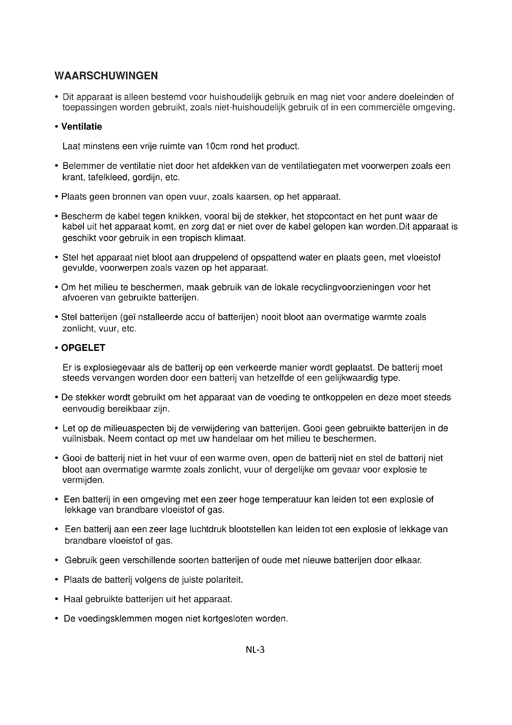 batterijen van hetzelfde type.NL-32 VERWIJDERING Als een verantwoordelijke verdeler hechten wij waarde aan het milieu. Daarom raden wij U aan om de correcte verwijderingprocedure te volgen voor uw product, verpakkingsmaterialen, en indien van toepassing, accessoires en batterijen. Dit draagt bij tot de instandhouding van natuurlijke bronnen en zorgt ervoor dat de materialen gerecycleerd worden op een manier die de gezondheid en het milieu beschermt. U moet de wetten en regels volgens voor verwijdering. Elektrische afvalproducten en batterijen moeten afzonderlijk van het huishoudelijk afval verwijderd worden wanneer het toestel het einde van de levensduur bereikt. Neem contact op met de winkel waar U het product heeft gekocht en met het plaatselijke bestuur om meer te weten over het verwijderen van afval en recyclage. De batterijen moeten verwijderd worden bij uw plaatselijk recyclagepunt. Raadpleeg de gebruiksaanwijzing om te weten hoe U de batterijen moet verwijderen voor afval. We bieden onze excuses aan voor elk ongemak dat veroorzaakt wordt door kleine onregelmatigheden in deze gebruiksaanwijzing die zich kunnen voordoen als het gevolg van productverbetering -en ontwikkeling.